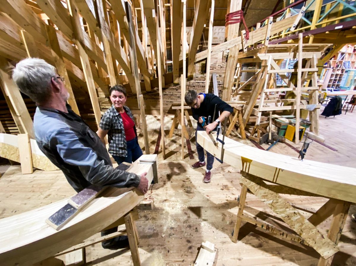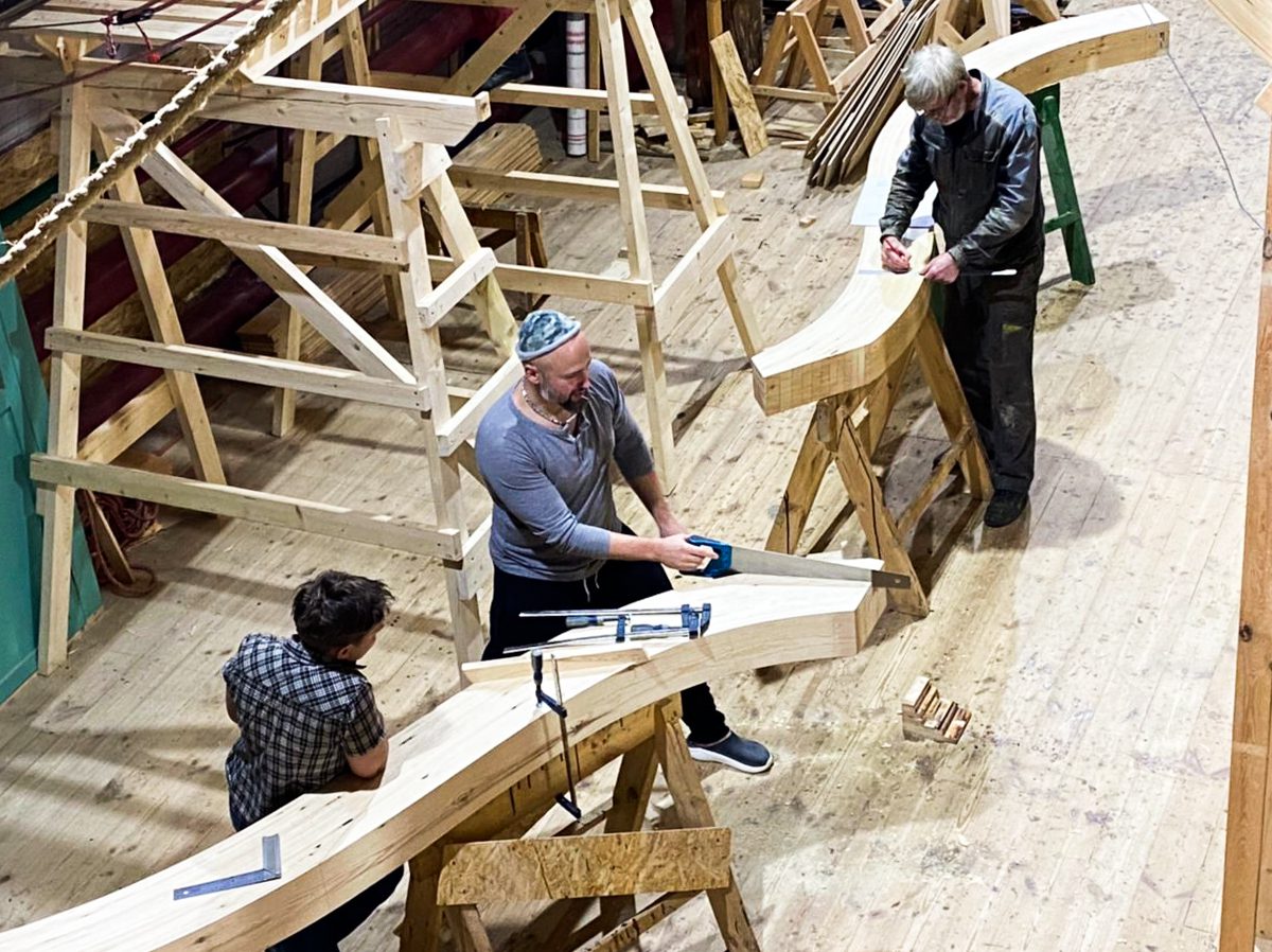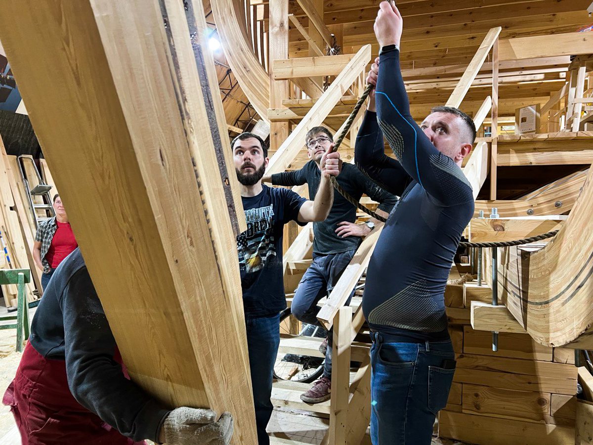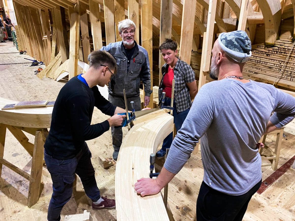 Артем начал возводить леса перед форштевнем шхуны. Игорь продолжает строить корму с другого конца. По бокам ученики школы судостроения клеят пятый шпангоут, а мы уже думаем о пятом. Школа судостроения набирает обороты, и мы наступаем по всем направлениям!