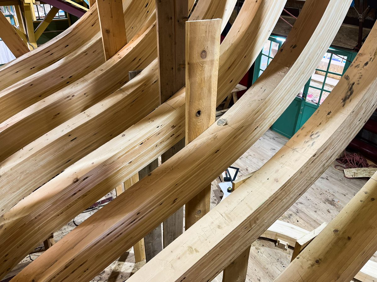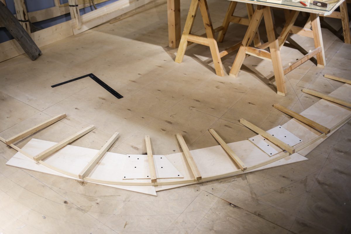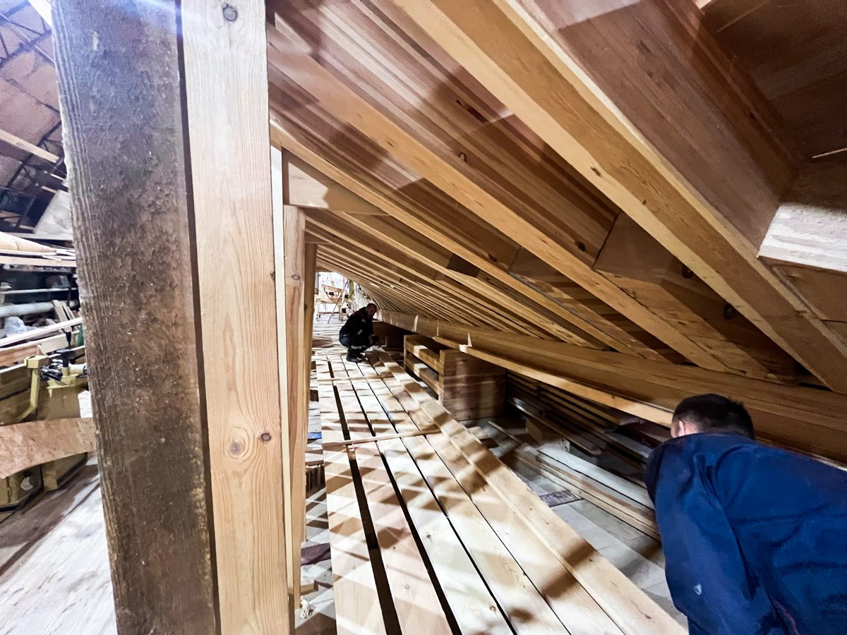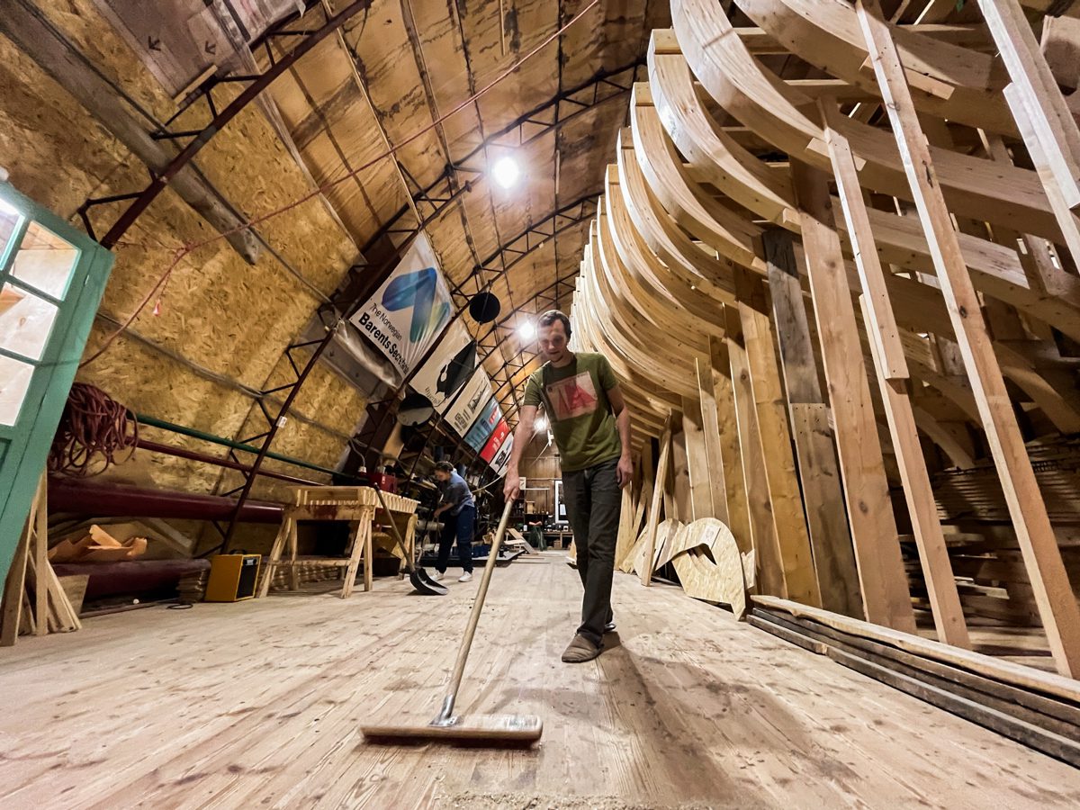Артем начал возводить леса перед форштевнем шхуны. Игорь продолжает строить корму с другого конца. По бокам ученики школы судостроения клеят пятый шпангоут, а мы уже думаем о пятом. Школа судостроения набирает обороты, и мы наступаем по всем направлениям!