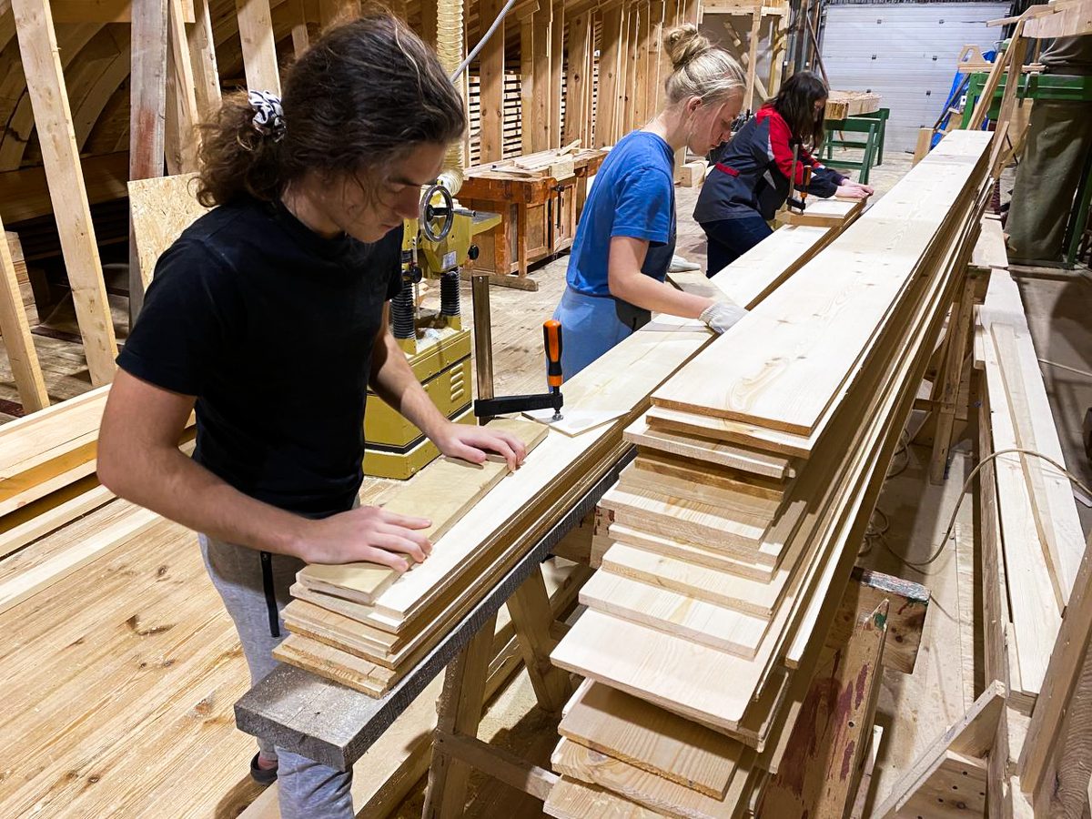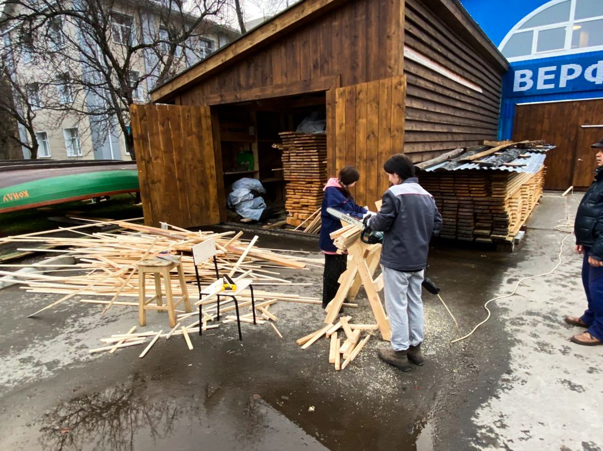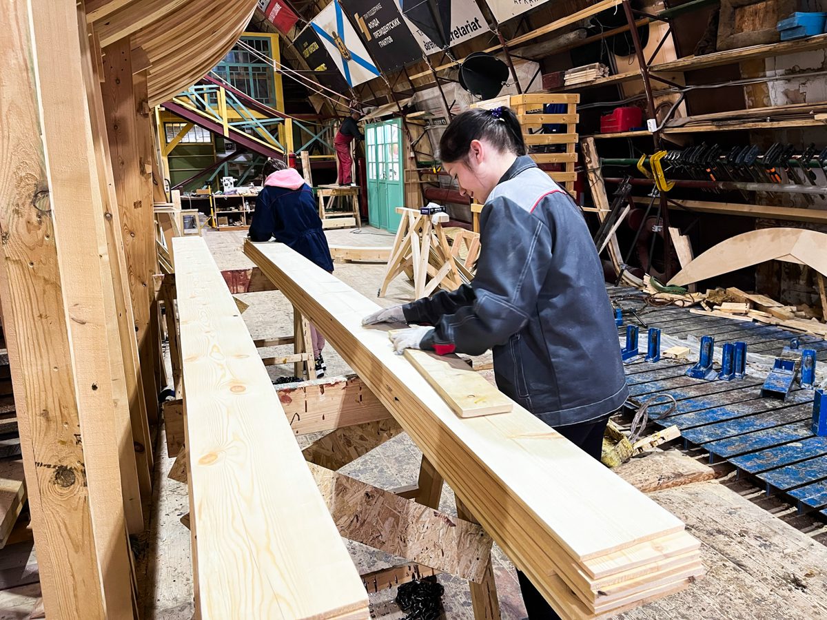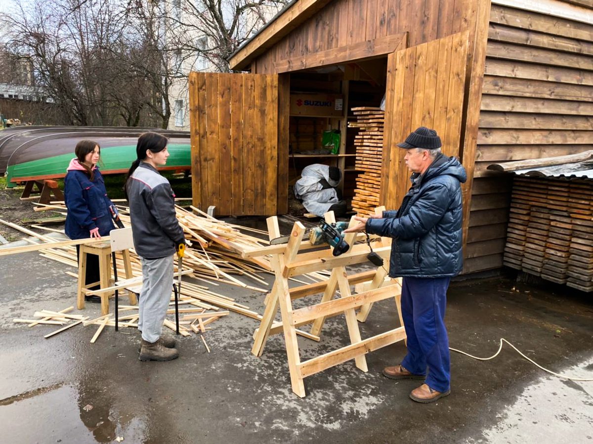 Девочки-практикантки шкурят доски, а Богдан с Артемом стратегически перекладывают их отсюда туда и оттуда сюда.