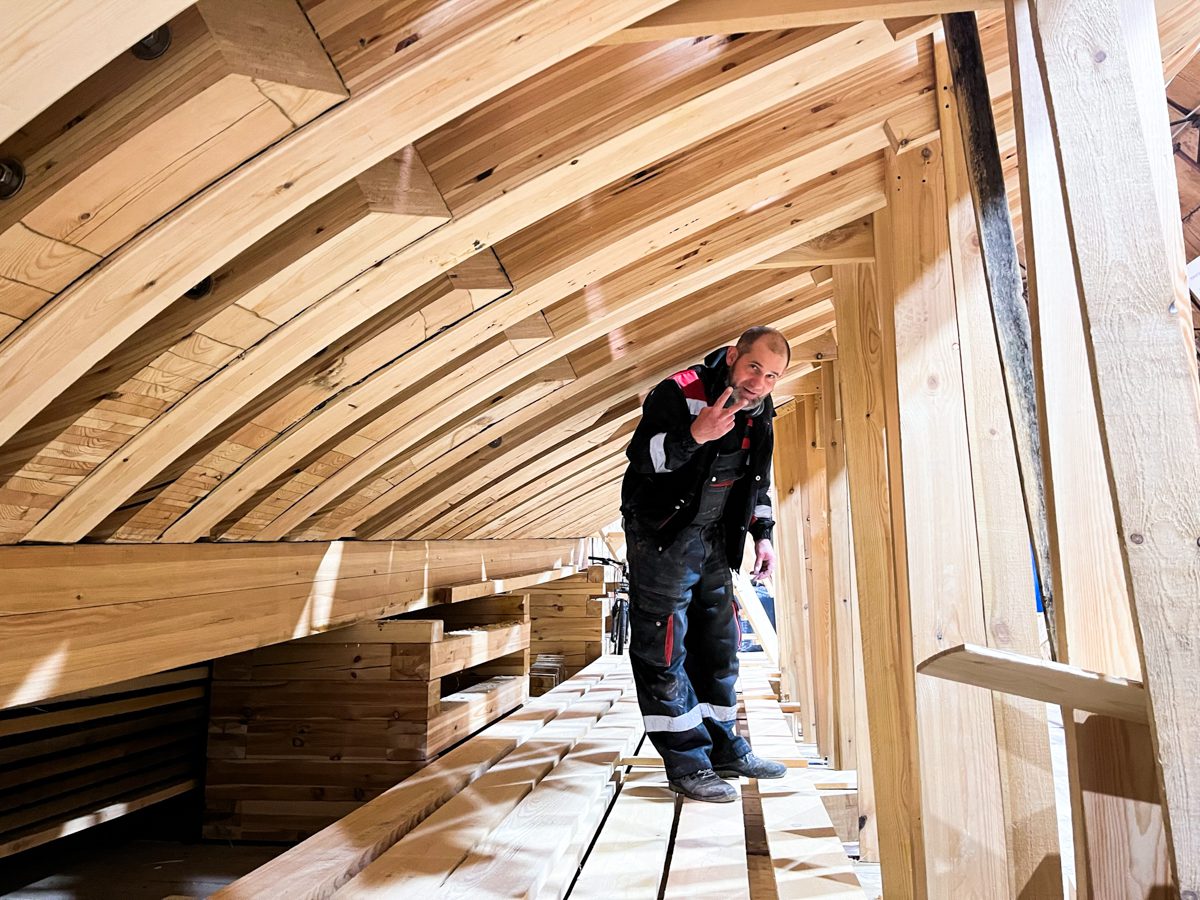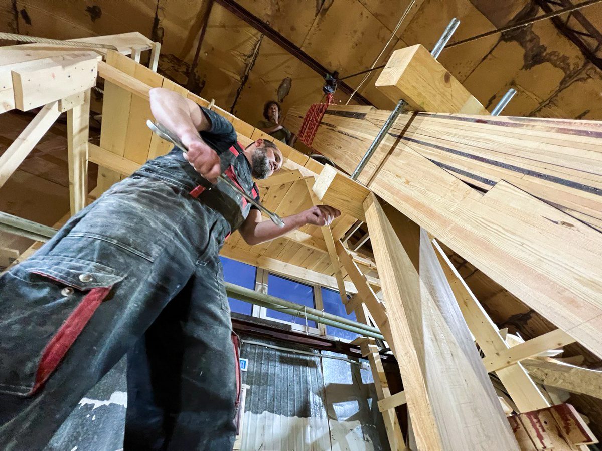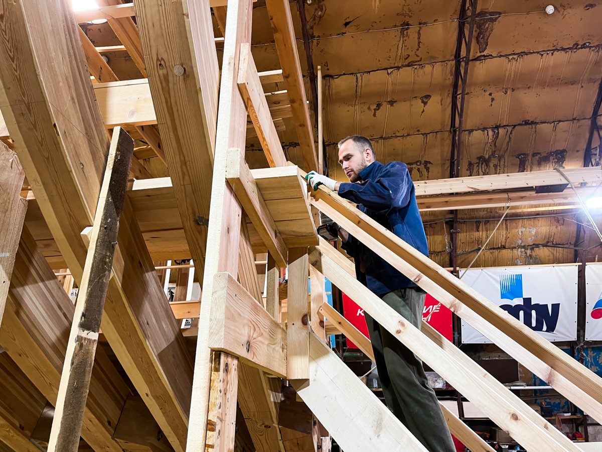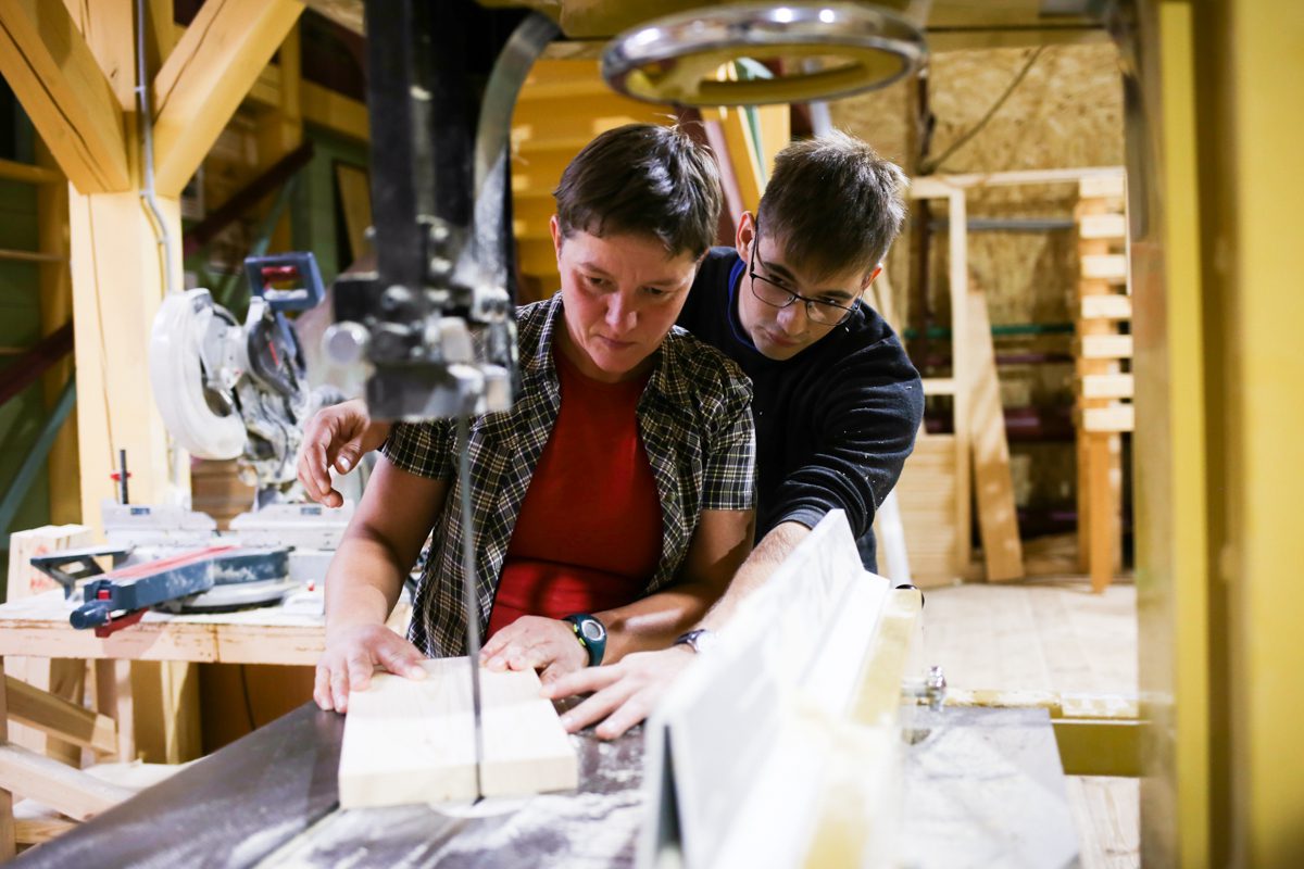Девочки-практикантки шкурят доски, а Богдан с Артемом стратегически перекладывают их отсюда туда и оттуда сюда.
