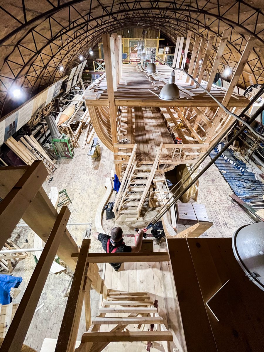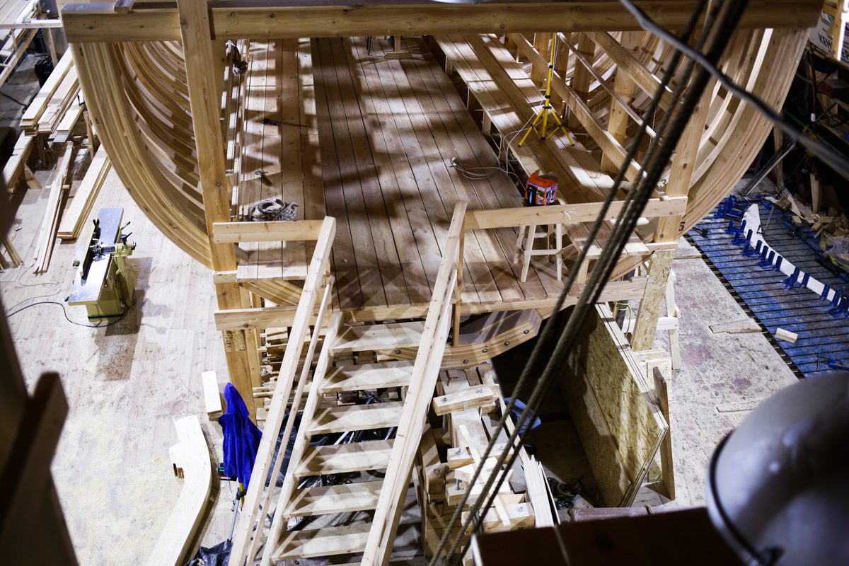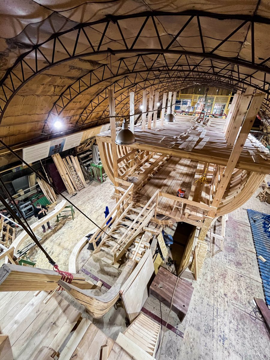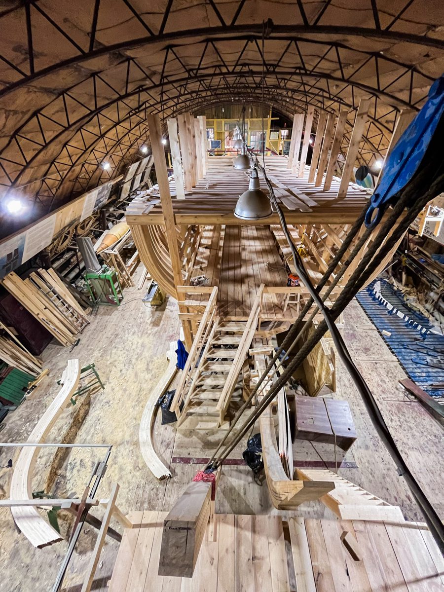 Артем достроил восхитительные леса перед форштевнем (чувствуется его богатый, исходящий из глубины детства опыт строительства домиков на деревьях). Теперь мы можем полюбоваться на свой корабль с высоты форштевня. Зрелище впечатляющее.