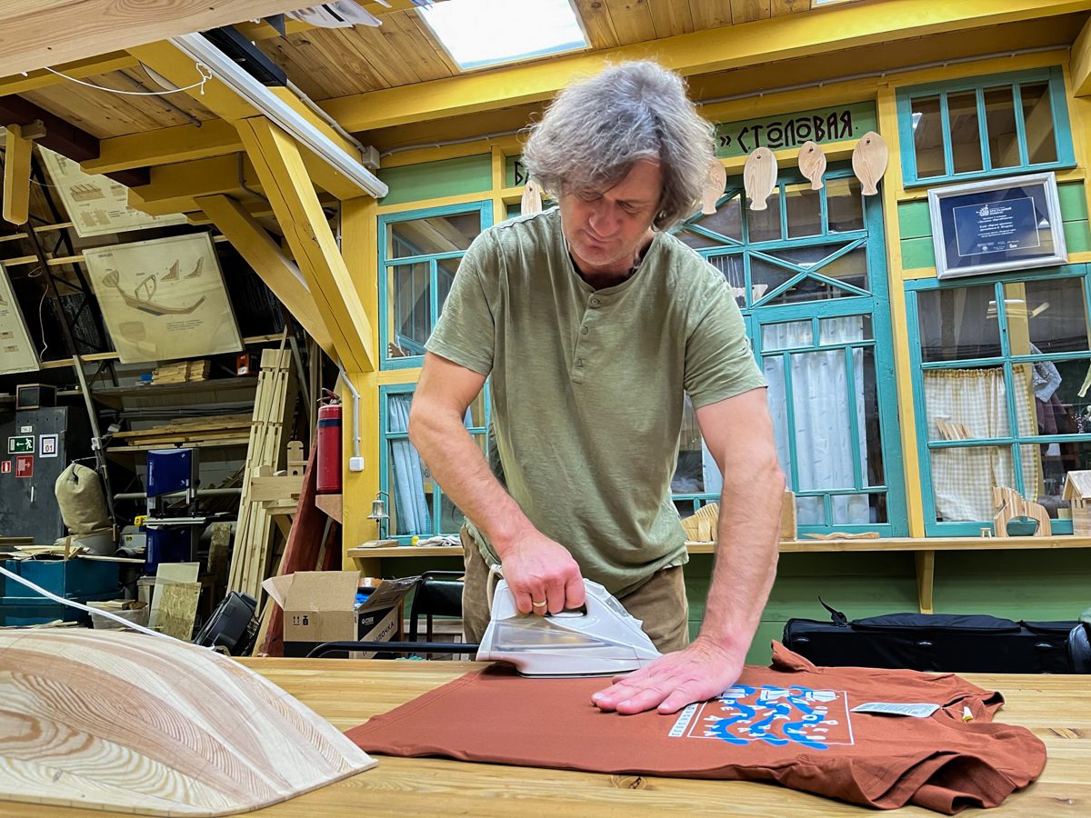Волонтеры под руководством Игоря готовят шаблон третьего шпангоута. Дима подключает нам стиральную машину и при этом довольно здорово поет. Александр зашивает крышу ангара. Женя гладит футболки. Катя начала фотографировать нашу сувенирную продукцию, а еще смонтировала фильм про строительство лодки-берестянки, и его просмотры сразу стремительно полетели вверх.