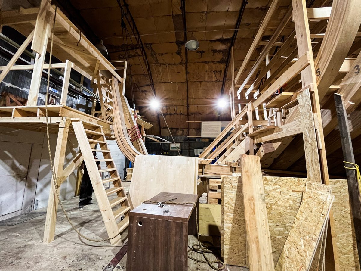 После завершения постройки лесов Женя с Ваней, Мишей, Артемом и волонтерами сняли волнорез, чтобы освободить от струбцин место, на которое будет установлен форштевень. Форштевень будем выполнять сразу с кнопом, гнутый.