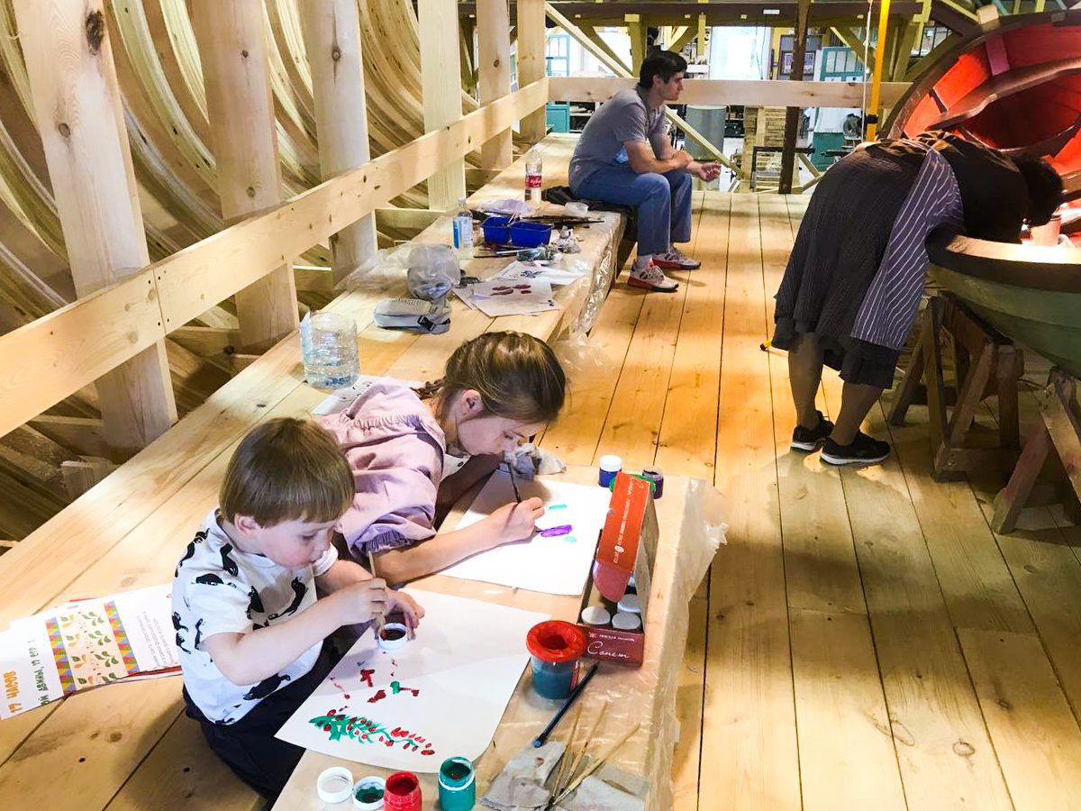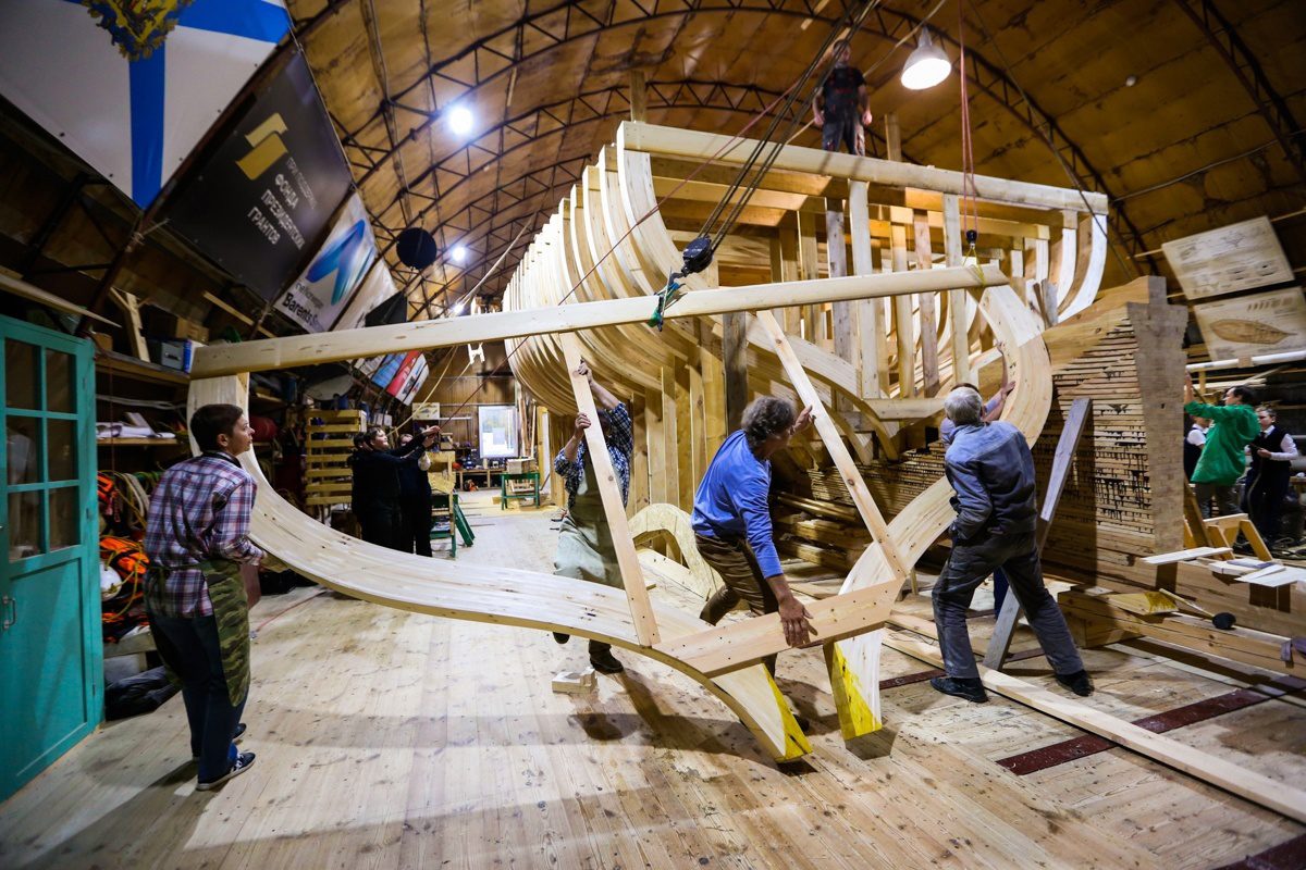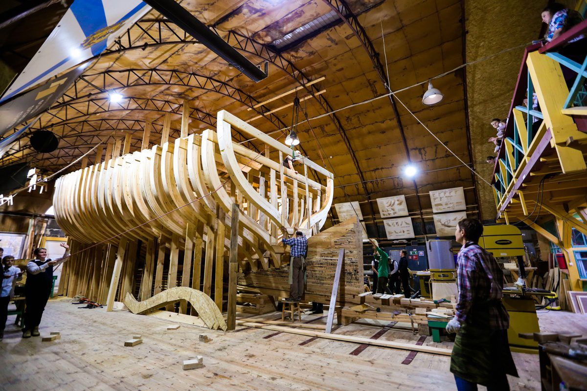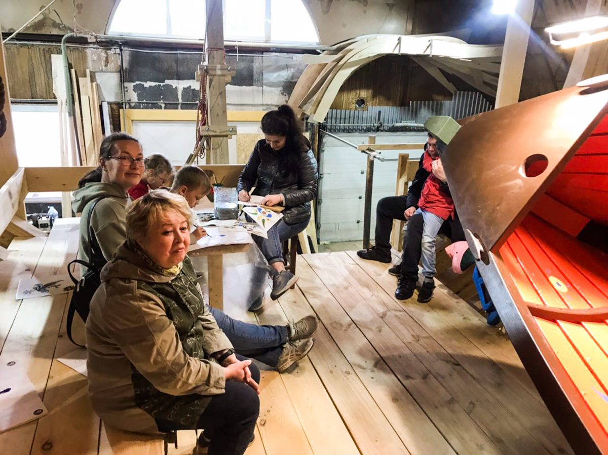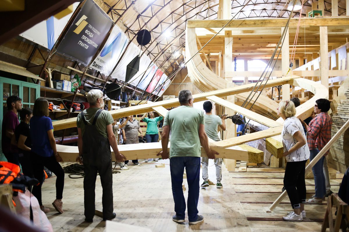 Уникальным творческим пространством и мастерской проекта стало пространство строящийся на верфи деревянной Поморской шхуны. Для устройства пространства и мастерской внутри шхуны оборудованы пол, лестницы и перила.