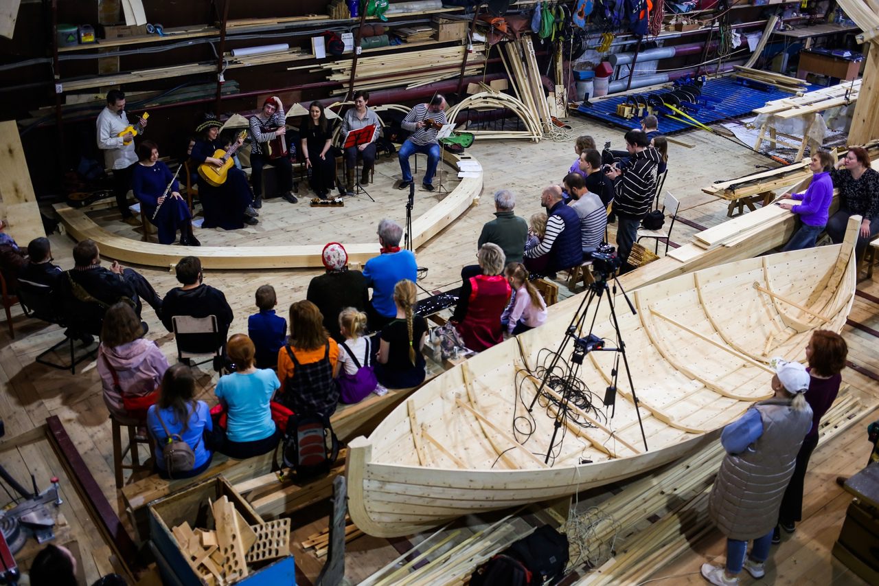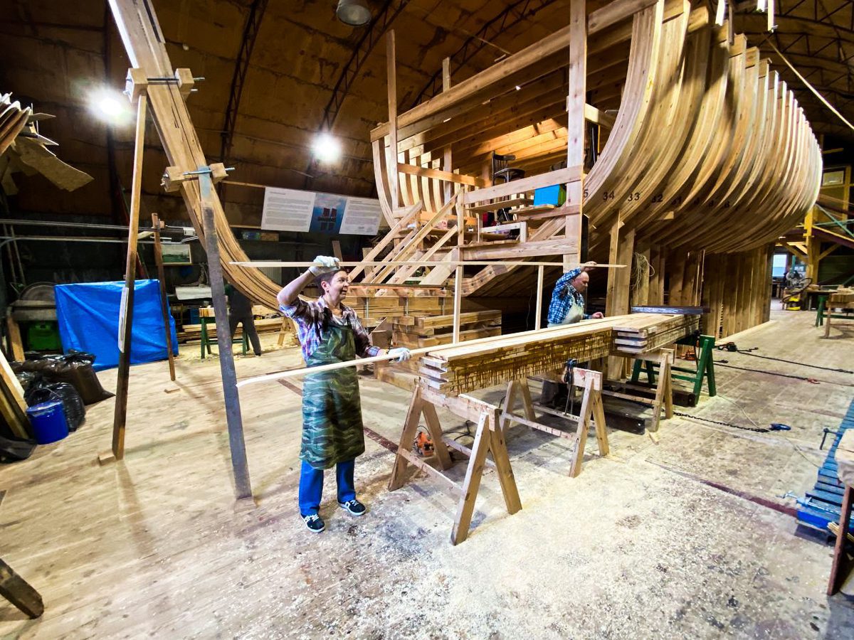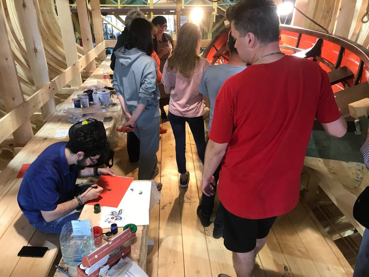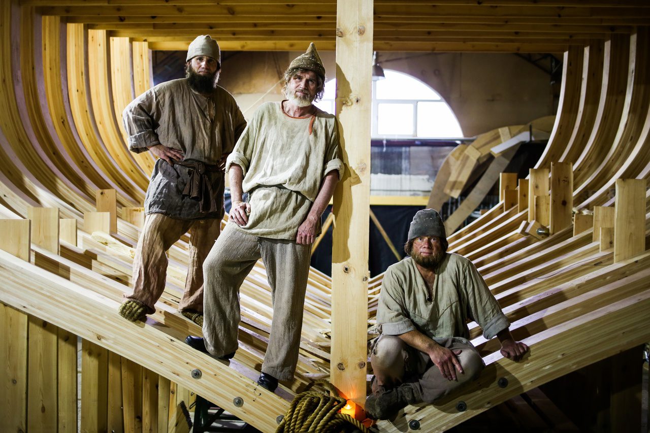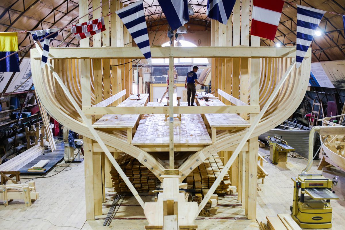 Уникальным творческим пространством и мастерской проекта стало пространство строящийся на верфи деревянной Поморской шхуны. Для устройства пространства и мастерской внутри шхуны оборудованы пол, лестницы и перила.