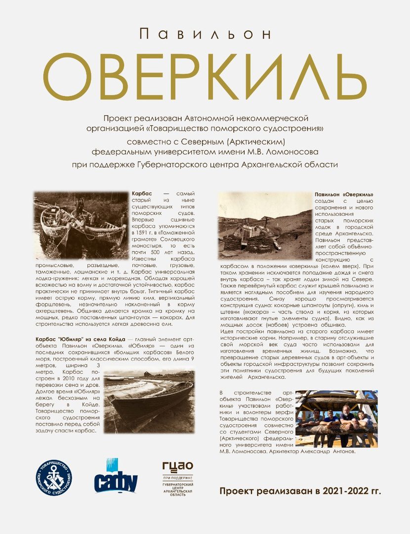 В процессе строительства конструктивных элементов Арт-объекта Павильон «Оверкиль» использовались традиционные плотницкие методы обработки и технологии создания конструкций из древесины, которые так же применялись старыми мастерами и при строительстве морских деревянных судов. Все несущие элементы конструкции вытесаны топором и обработаны скобелем или стругом. Врубки в узлах соединений выполнены в соответствии с методами и приёмами деревянного зодчества Русского Севера. Такая манера исполнения дает возможность посетителю павильона разглядеть технологии обработки деревянных конструкций карбаса и конструкции арт-объекта. Павильон «Оверкиль» расположен на территории рекреационной, парковой зоны Северного (Арктического) федерального университета им. М.В. Ломоносова рядом с верфью Товарищества поморского судостроения.