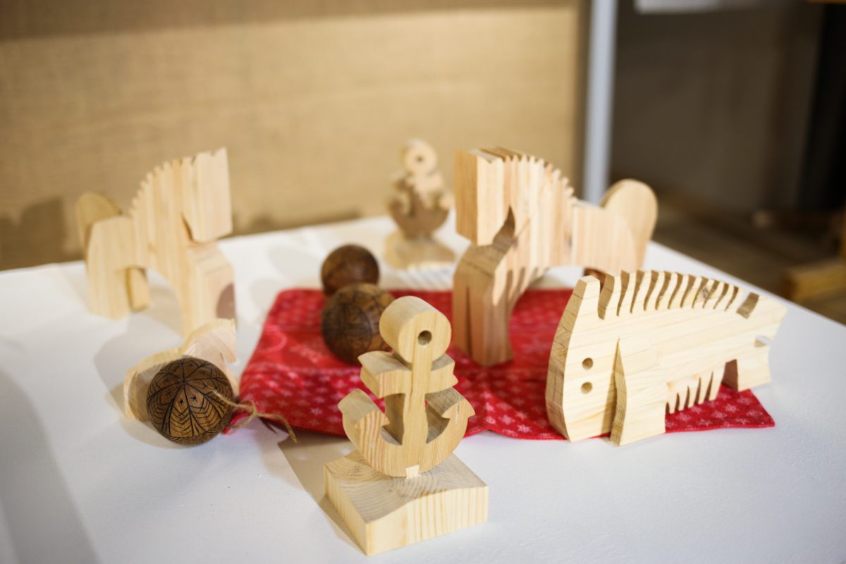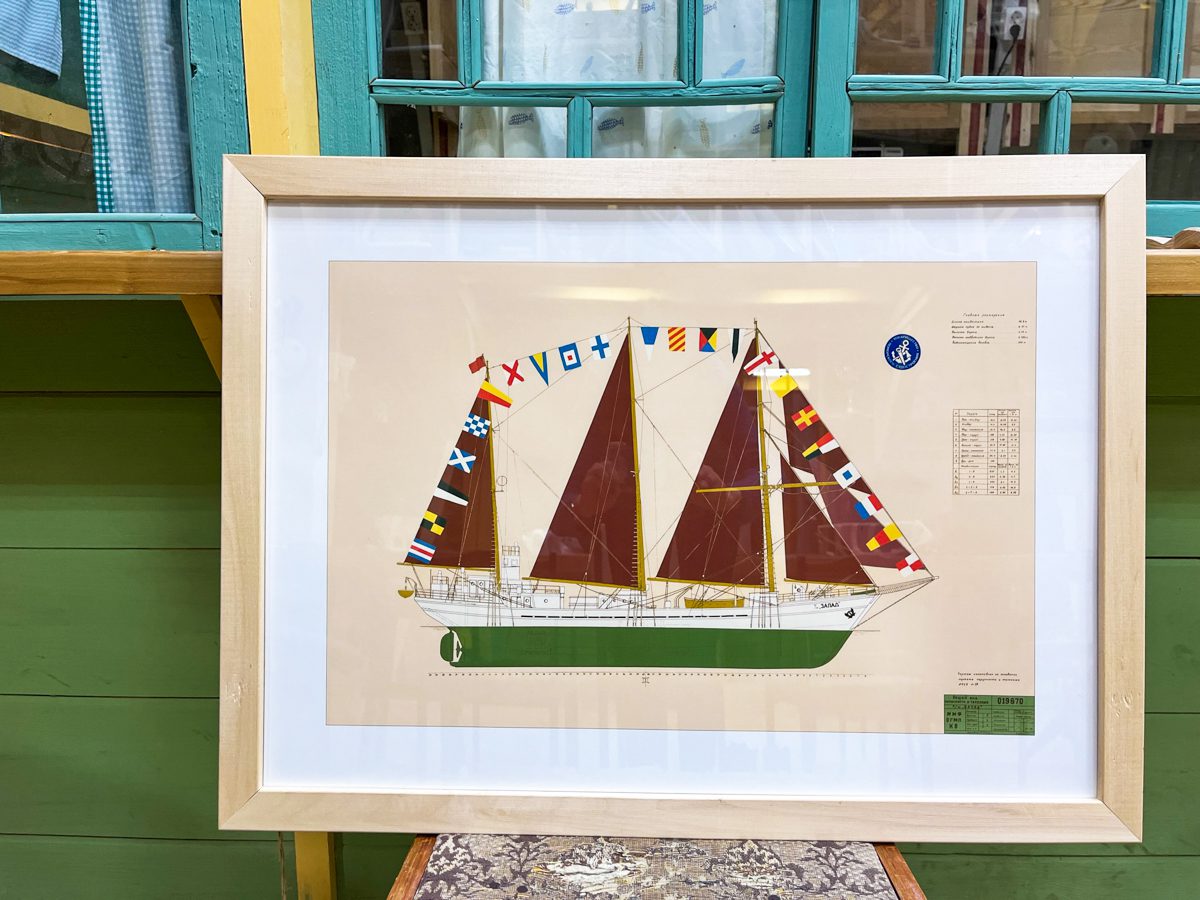 – сувенирный магазин с деревянными конями, рыбами и якорями от плотника-архитектора верфи Александра Антонова; северными козулями от мастера Натальи Матониной, корабликами и морским «Мемори» от художников Евгения Гриневича и Натальи Куликовой; точеными ёлочными шарами, яблоками и грушами от нашего столяра Ивана Горбунова; кружками с «Вашкой» кисти Кати Флоренской; футболками с «Поморской шхуной» художника Сергея Беспамятных; тельняшками от бренда Annie Moree и, конечно, постерами с чертежами архива Соломбальской судоверфи, которые подготовили для вас наши дизайнеры Дарья Гасюн и Катя Суворова.