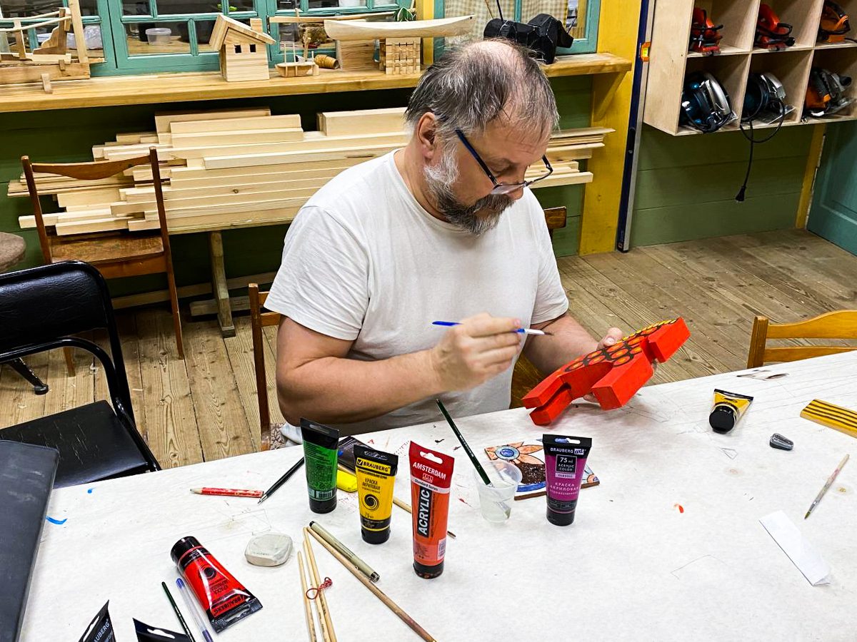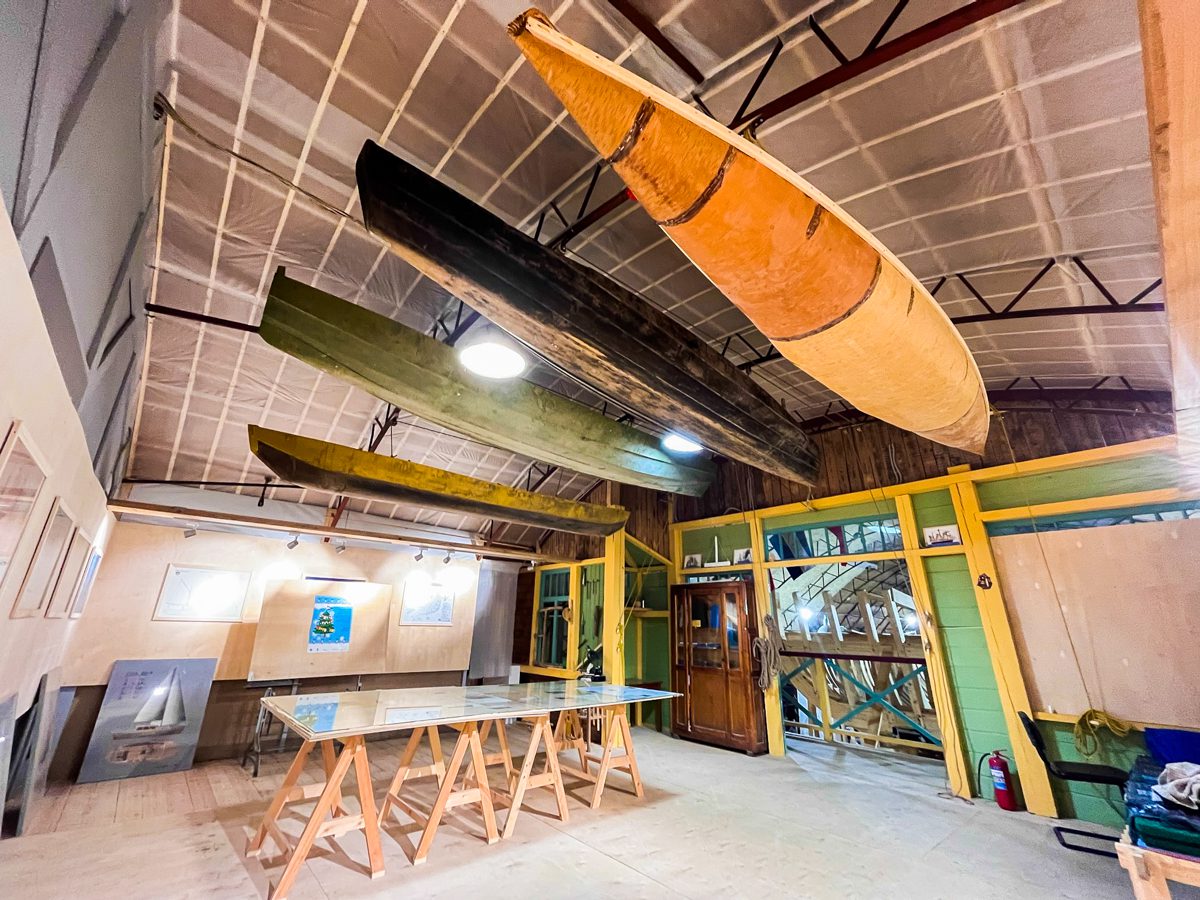 Александр-механик развешивает под потолком «Открытой палубы» наши традиционные народные лодки. Артем реставрирует двери.