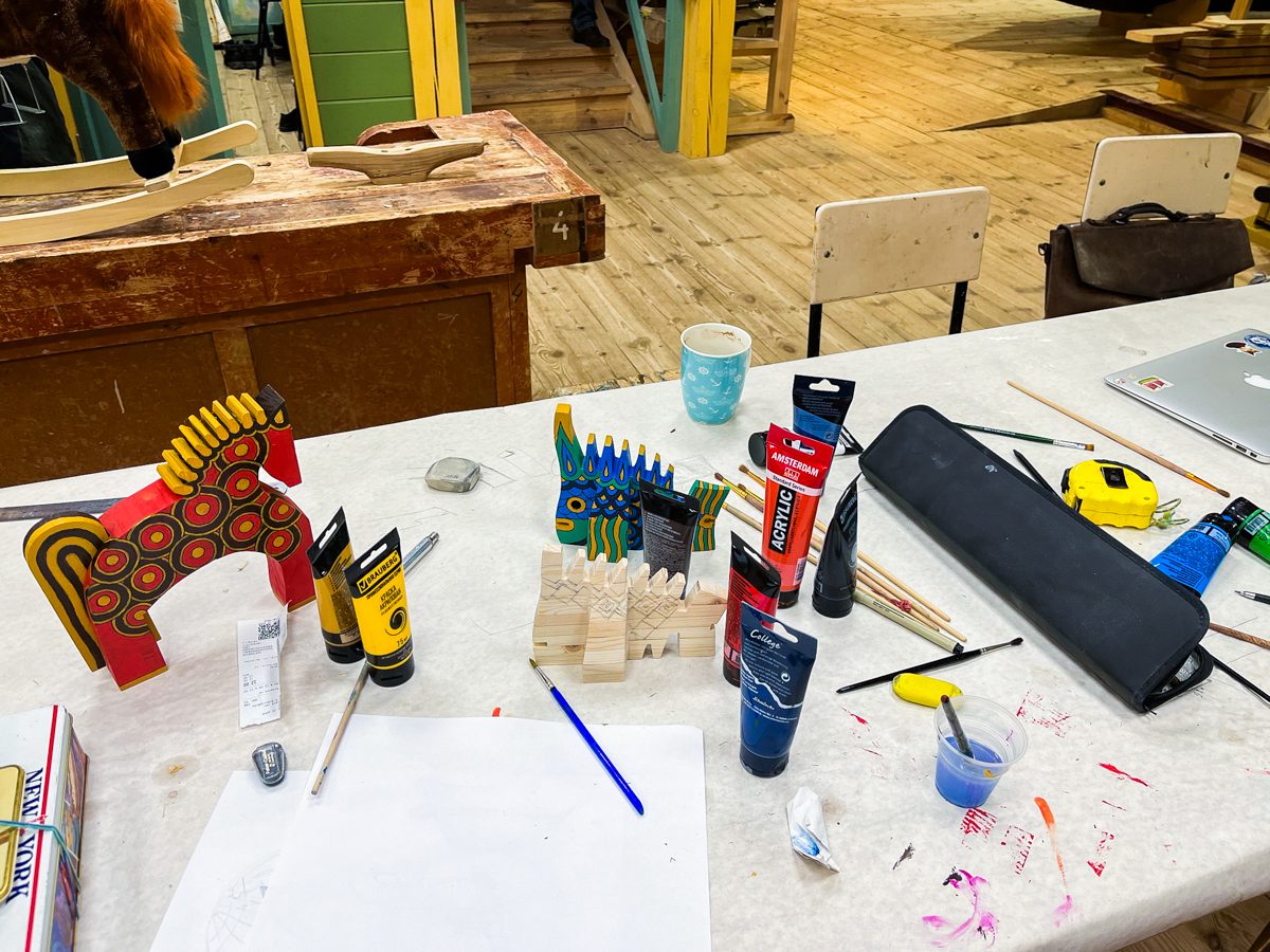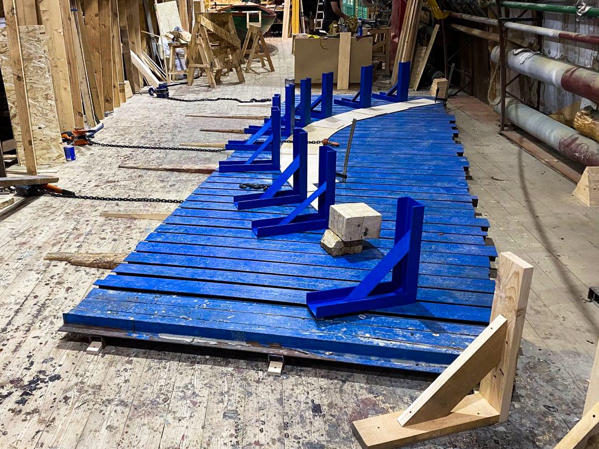 Покрасили в синий цвет гибочный стол вместе с уголками и струбцинами. Любо-дорого глянуть. Пришли студенты, занесли на верфи карбас «Койду». Потом стали двигать гибочный стол. Стол нужно повернуть так, чтобы на нем поместился форштевень, который мы намерены вскоре заклеить.