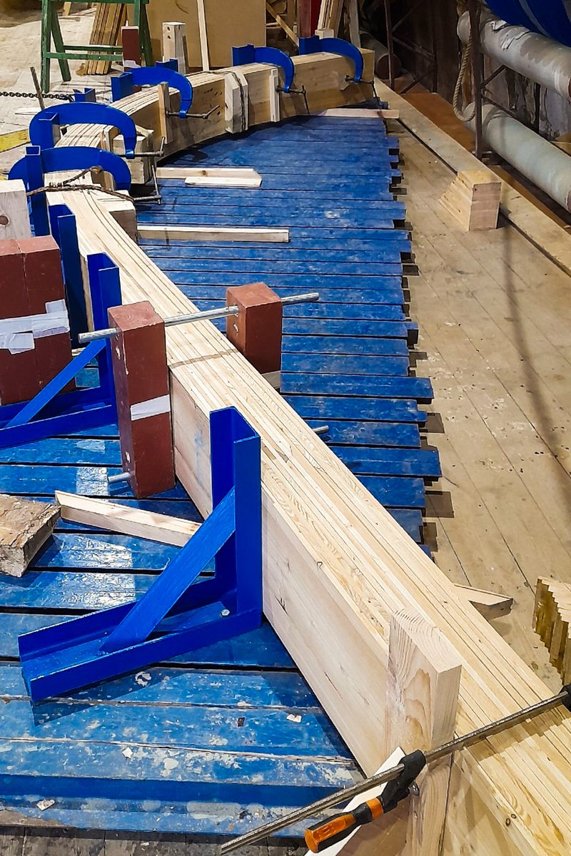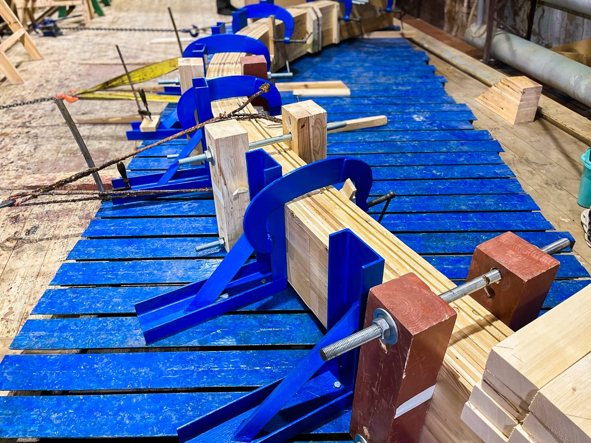 Сделали его пробный зажим на сухую. Самое лучшее в этой фотографии то, как Миша ходит вокруг заготовки, заложив руки за спину и слегка наклонившись вперед. Наш Миша сканирует форштевень своим внутренним 3D-сканером, буквально просвечивает его насквозь своим инженерным рентген-взглядом!