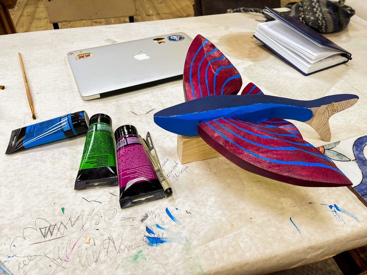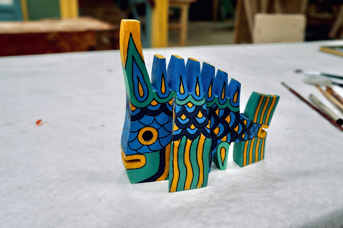 Саша Антонов, который ранее расписывал коня, был озарен свыше и начал выпиливать летающую рыбу, а потом расписывать уже ее. Предыдущую свою рыбу он разместил в фонарном плафоне, как в аквариуме. «Рыбе нужна вода», – резонно заметил Миша.
