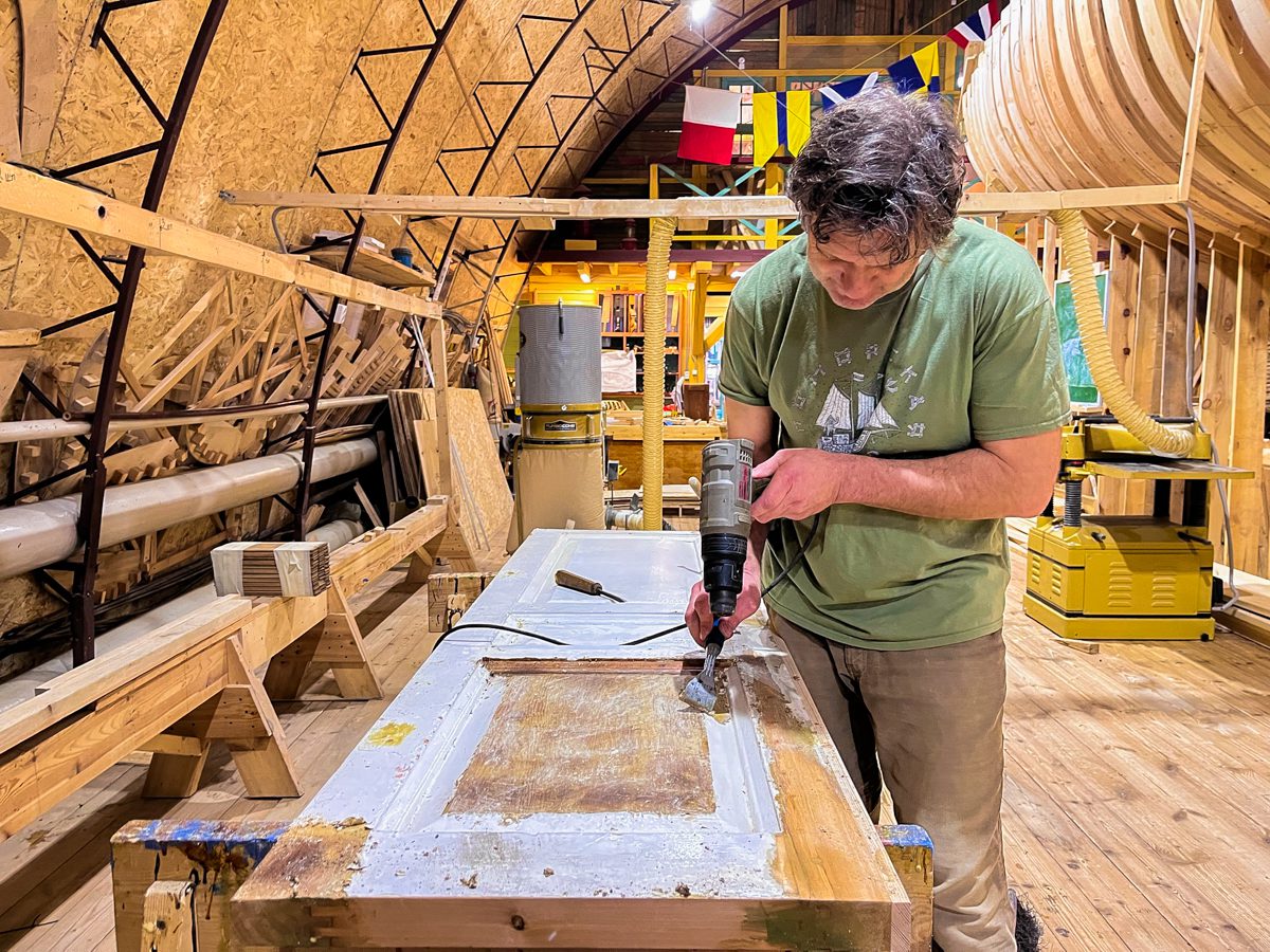 Пока Артем занят форштевнем, Женя перехватил эстафету с реставрацией дверей.