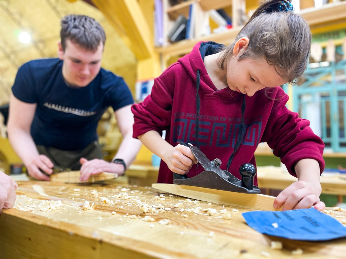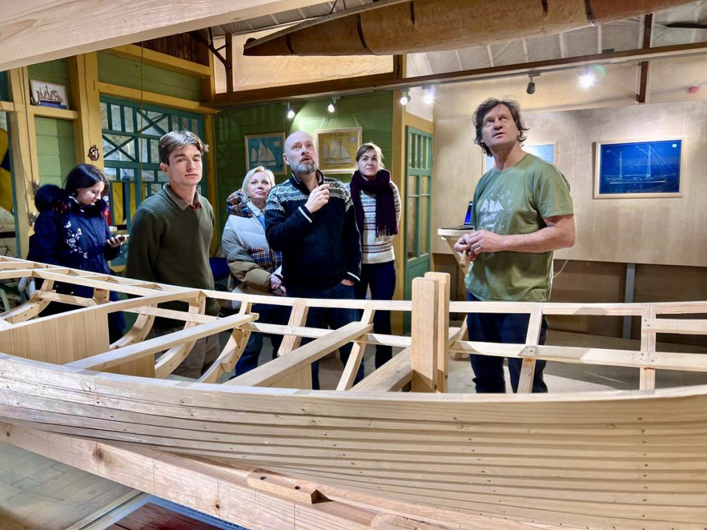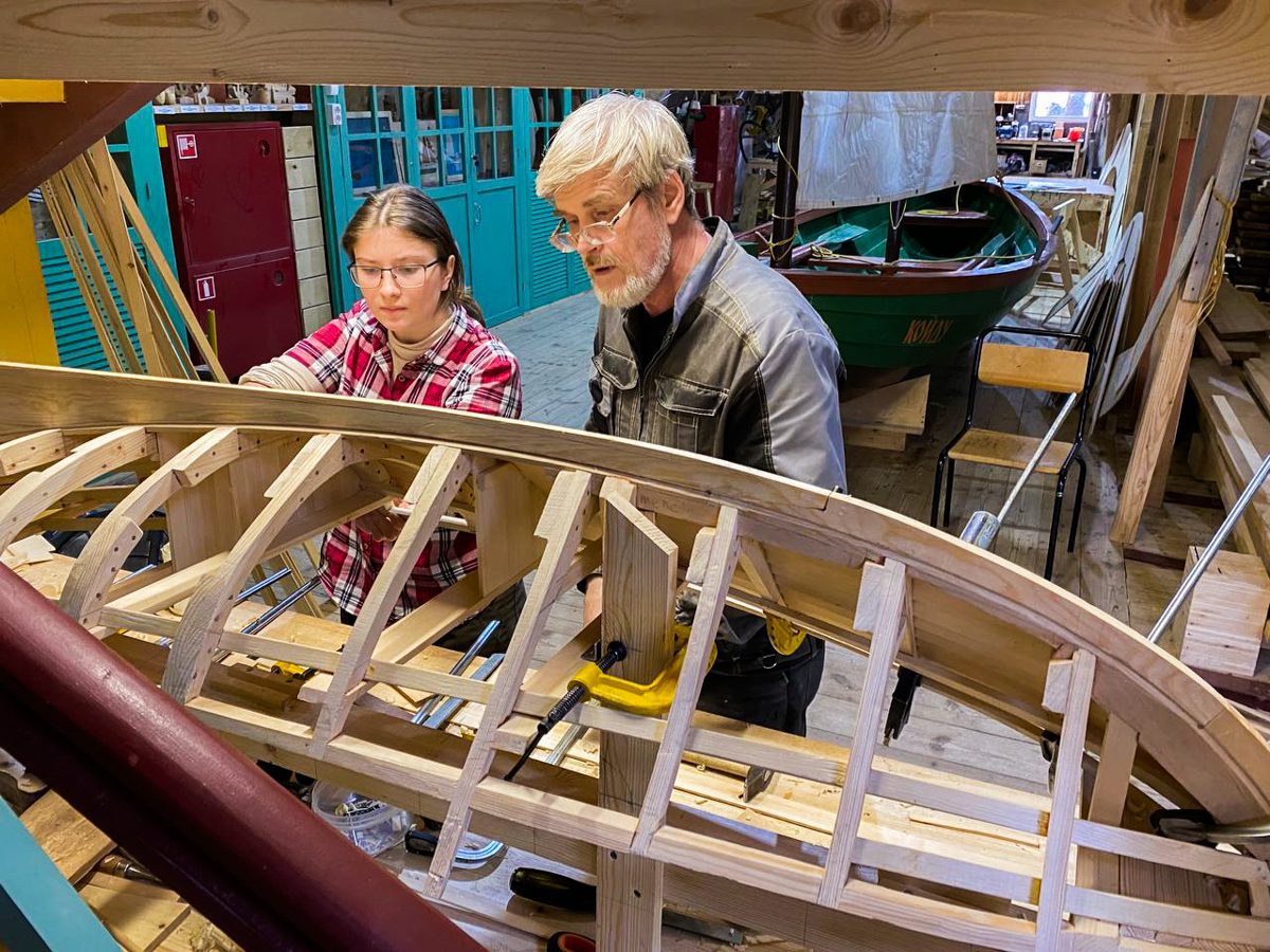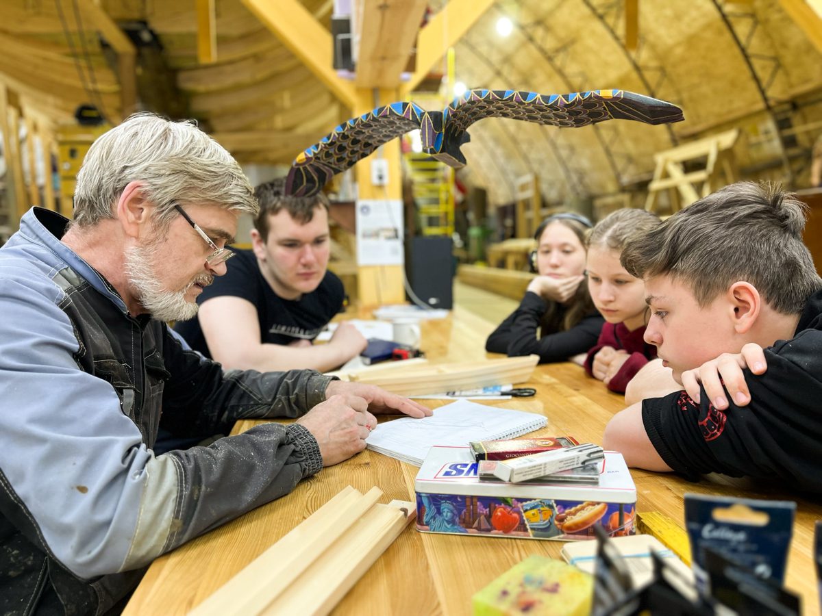 Кроме того, на верфи побывали четверо школьников-победителей и призеров Всероссийской олимпиады по судостроению. Ребята приехали в Архангельск из города Мирный вместе с руководителем соцпроекта «Взгляд в будущее». За неделю под руководством нашего столяра Игоря Козьмина они смогли построить несколько разных моделей: парусную, моторную и гребную лодки на основе зырянки из коллекции верфи.