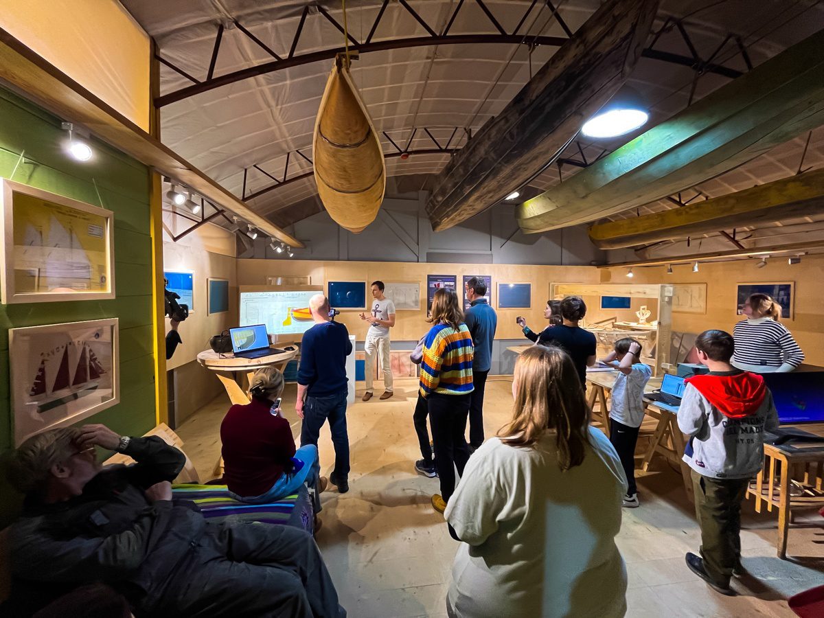 Специально для гостей инженер «Поморской шхуны» Михаил Крупенин опустил из-под потолка осиновку из нашей коллекции и рассказал ребятам о процессе 3D-сканирования деревянных судов и работе с цифровыми слепками лодки.