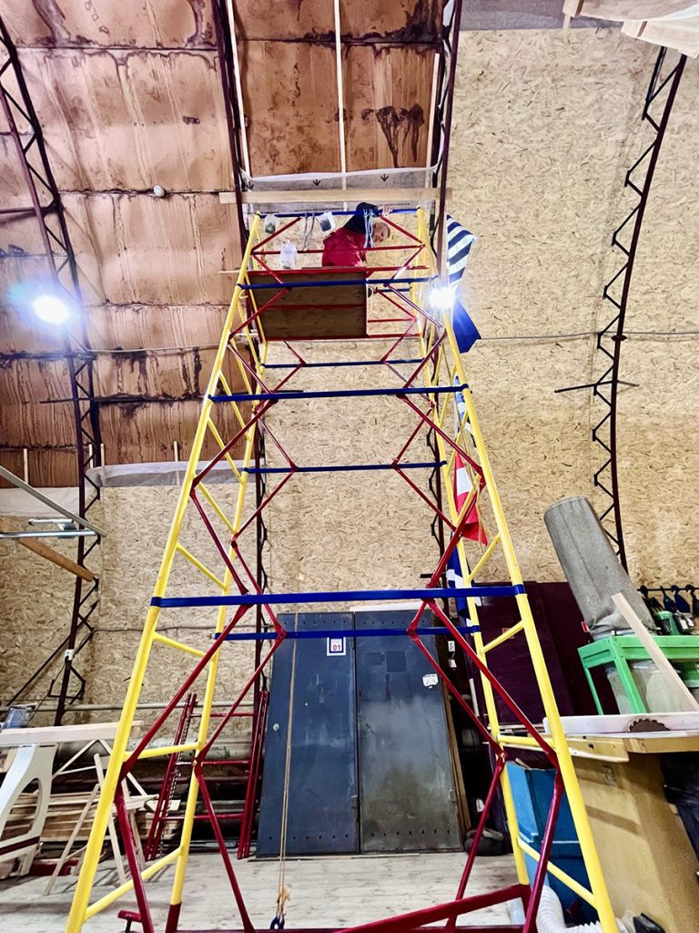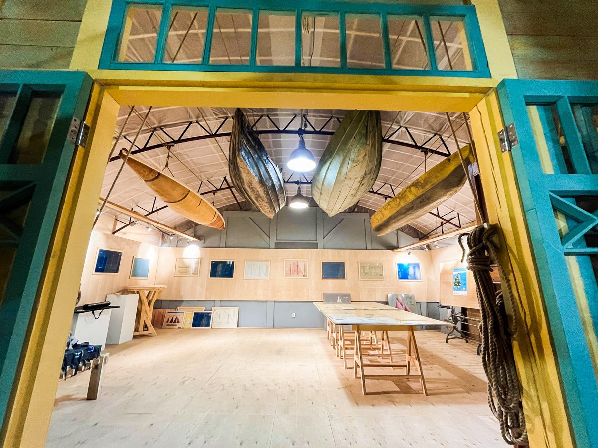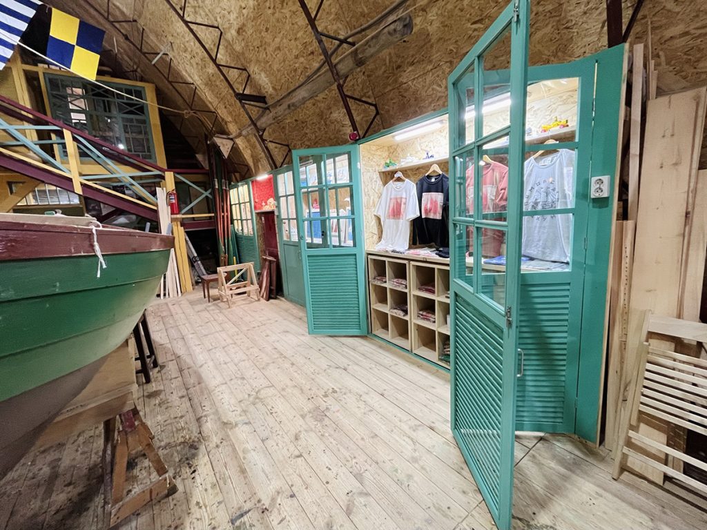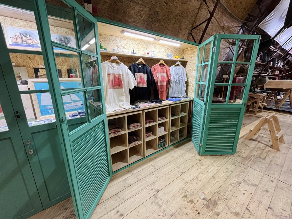 Весной в рамках проекта «Заветный флот» продолжились работы по благоустройству выставочного пространства верфи: обшивка потолка ангара, устройство витрин сувенирного магазина и их освещения.