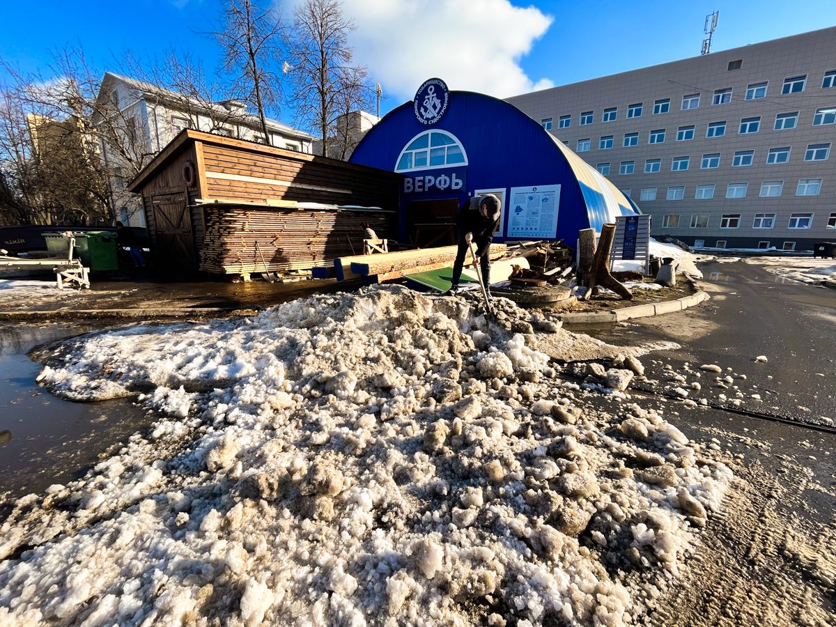 Студенты демонтируют сугроб возле входа на верфь, прямо вот на запчасти его разобрали.