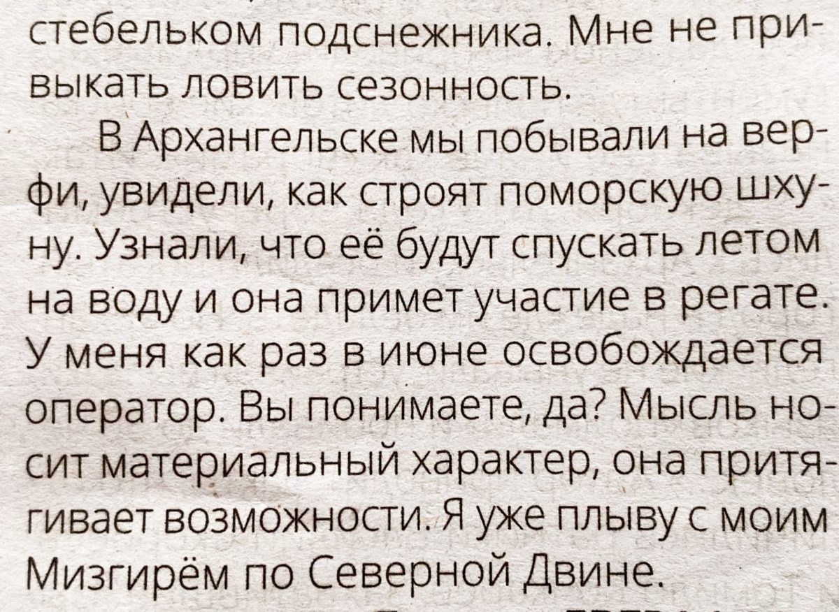 Женя и Нуркен сразу отправились по домам сушиться. Артём как самый стойкий (и обладающий сменной одеждой) вернулся на верфь. Переоделся в сухое, ходит по верфи, поклеивает доски на дейдвуд и смеется. Говорит: «Хочешь, Катя, поехать с нами в лес в следующую пятницу? А? Не желаешь ли прошвырнуться, а? А то давай! Интересно же!» – и удаляется вглубь верфи, повторяя те два слова, с которых он начинал свой рассказ.