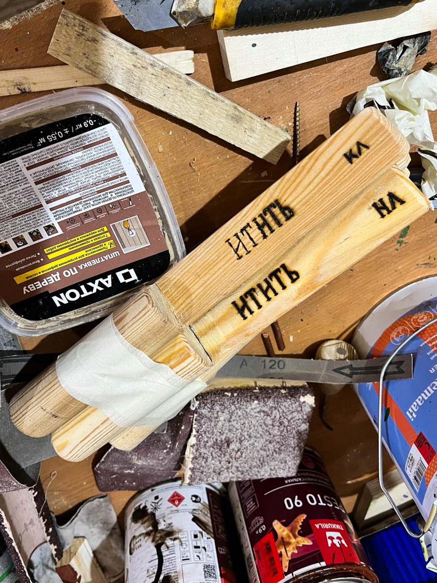 КочетА – древянные штыри, которые вставляются в специальные гнезда на бортах. Эти вертикальные штыри заменяют на традиционных лодках уключины для весел. При гребке весло упирается в кочет, во время обратного взмаха – весло удерживается специальной веревкой или свитой в кольцо. На рыбацких лодках кочета делают быстро-съемными, чтобы легко выбирать на борт сеть. Наши кочета покрепче и всётаки они иногда ломаются во время гребных гонок. Игорь приготовил комплект кочетов на карбас «Итить». Аббревиатура КЛ – видимо, обозначает «корма-левый», НЛ – нос-левый. Е.Ш.