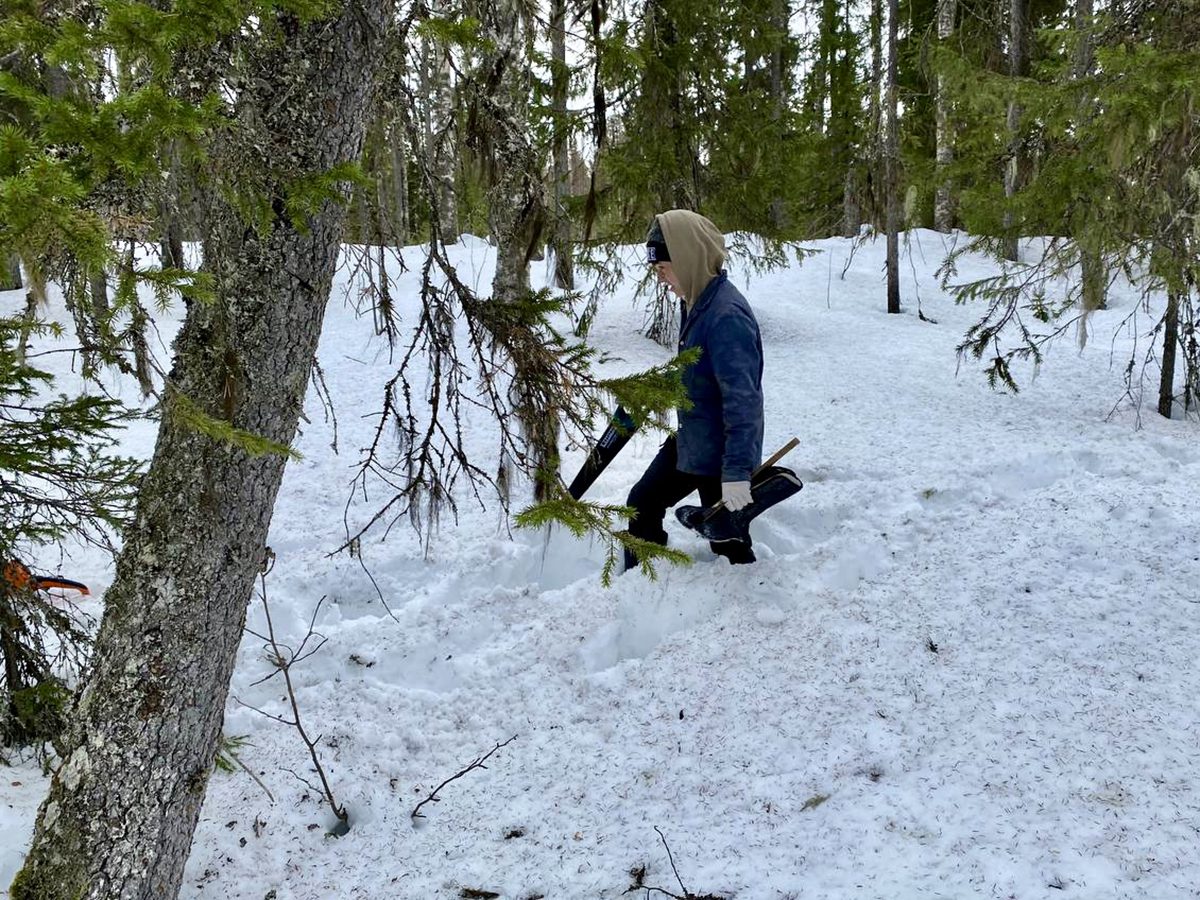 С утра Женя, Артем и Нуркен отправились в лес. Необходимость спилить несколько ёлочек на мачты назрела довольно давно. По необъяснимым причинам выбор пал именно на сегодняшний день, чтобы  – внимание! – успеть заготовить лес до весеннего движения сока (вот как красиво звучит). Возможно, именно в весеннем движении сока таилась интрига, породившая все дальнейшее драматическое развитие лесного сюжета.