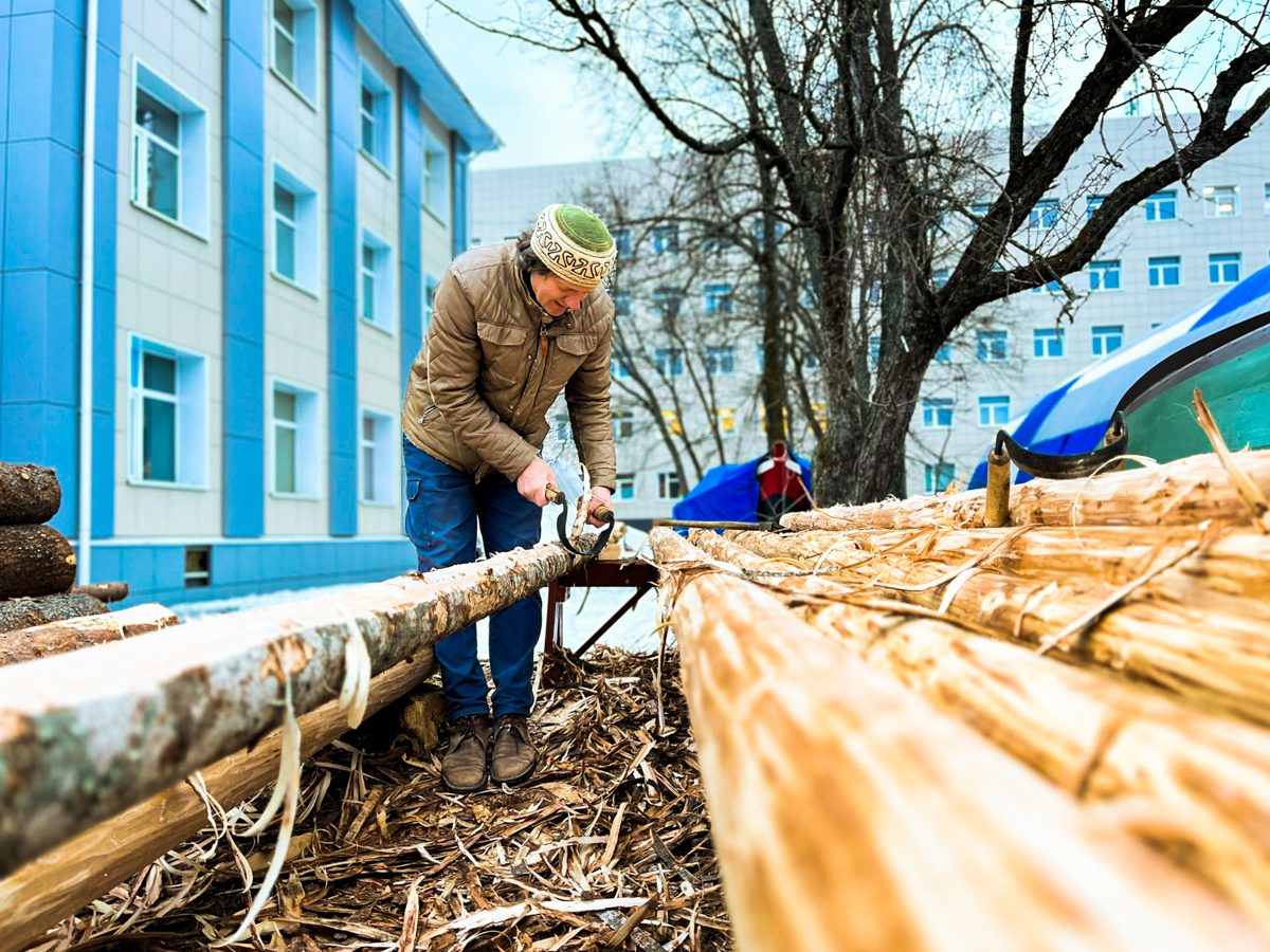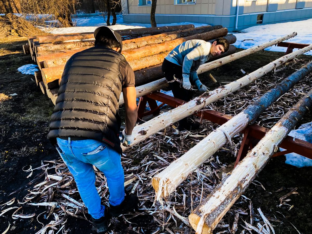 Для прясла начали окаривать жерди. Участвуют в этом процессе студенты и жители Архангельска.