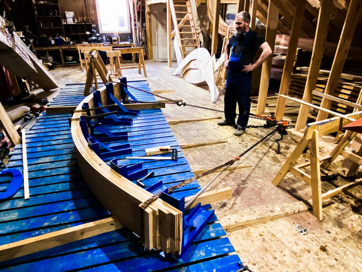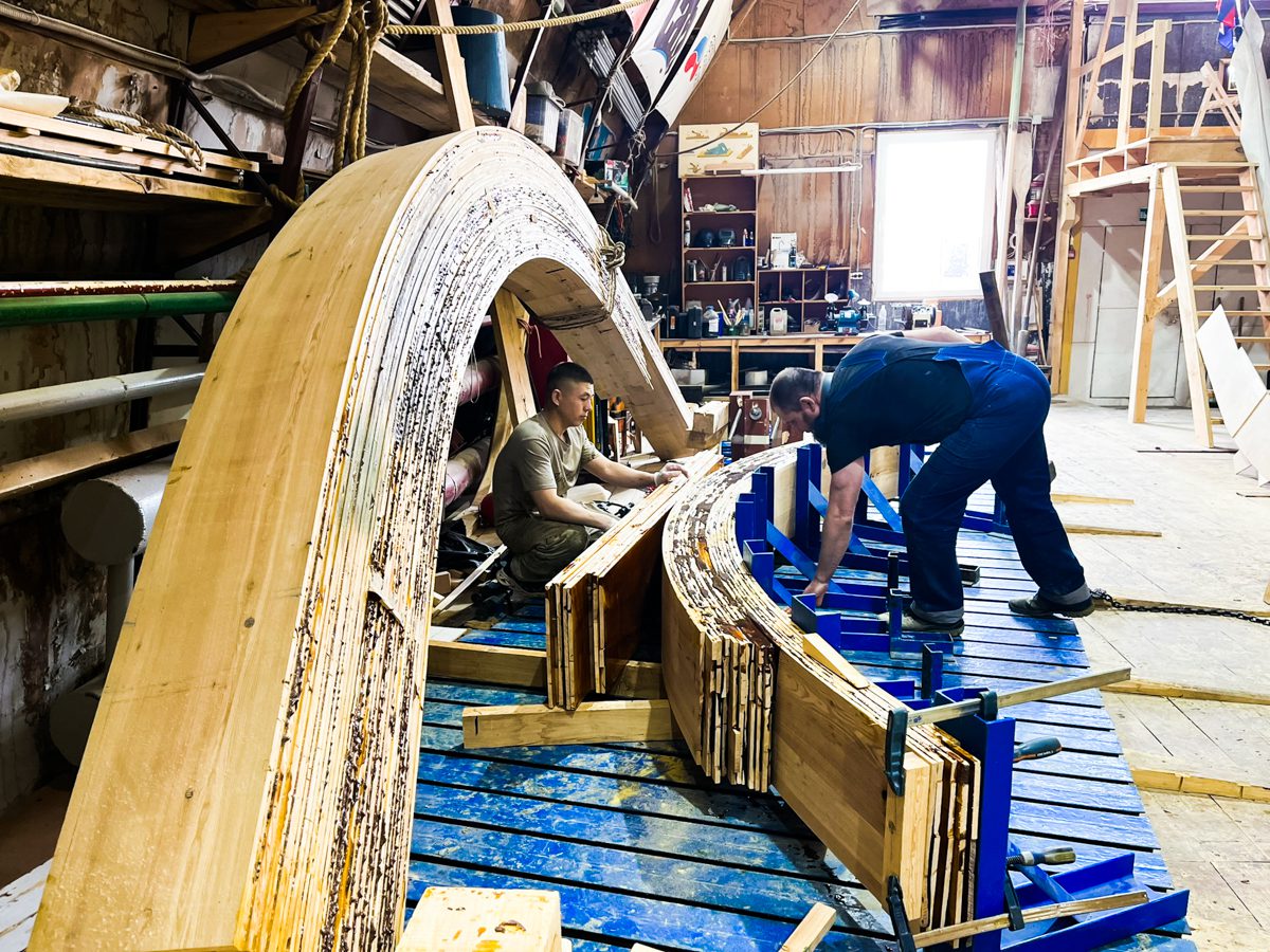 Артем с Нуркеном приклеили второй слой добора форштевня. Нынче они не загибают ламели внутрь, а делают такой горбик: крепят середину доски и подтягивают заготовку с двух сторон. Заклейка получается похожей на натянутый лук.