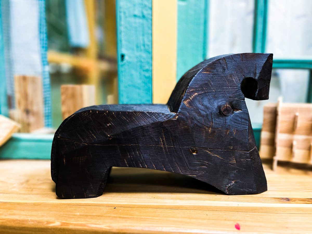 Прикупили для экспозиции «Заветный флот» вороного деревянного коня топора Саши Антонова. Конь этот не крашеный, а жженый, вот как.
