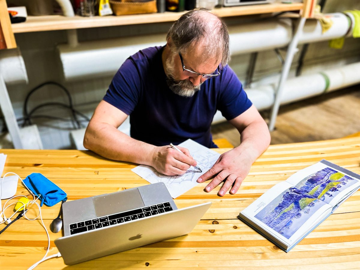 Игорь ремонтирует «Итить» и доклеивает модель ёлы.