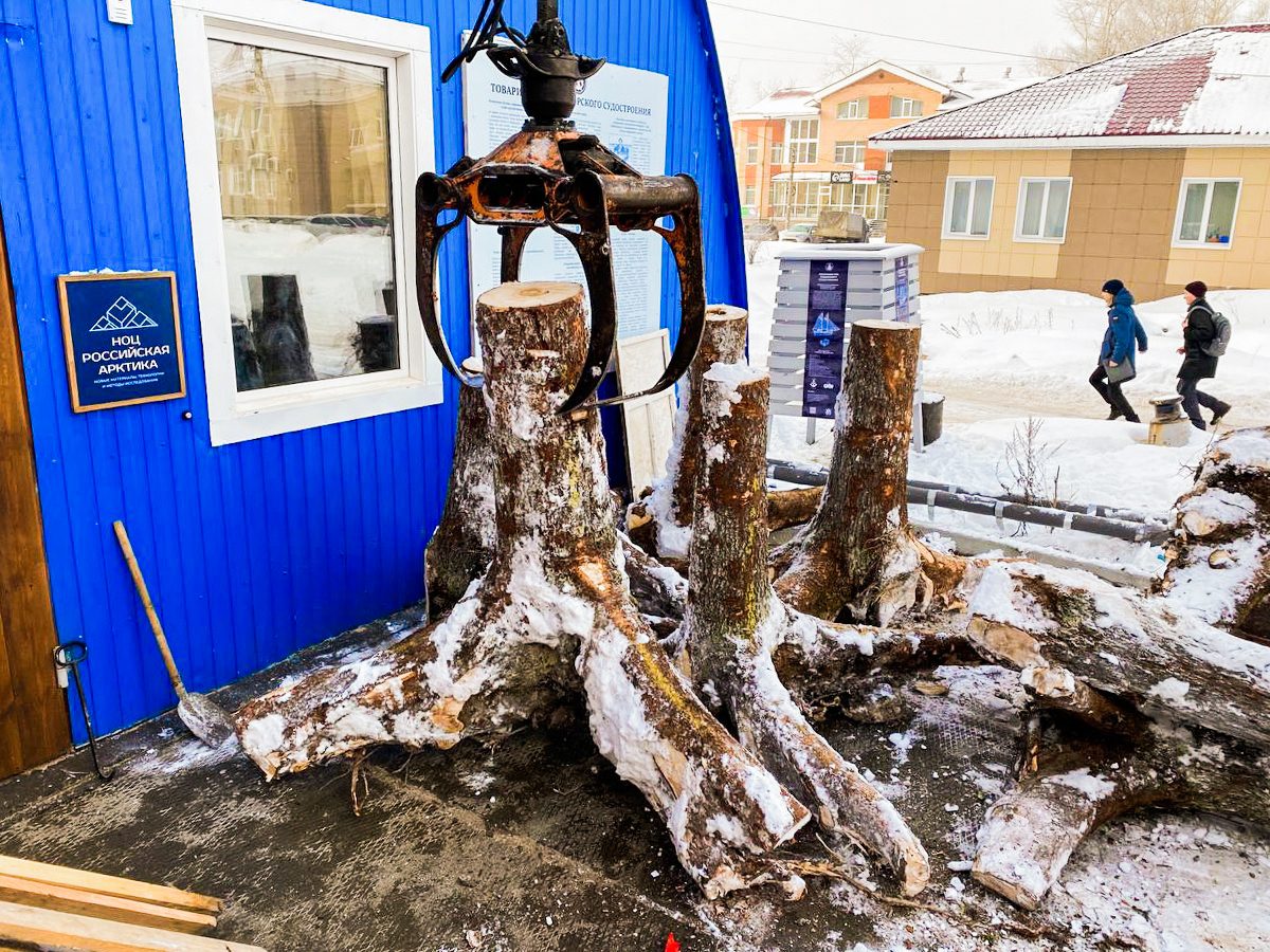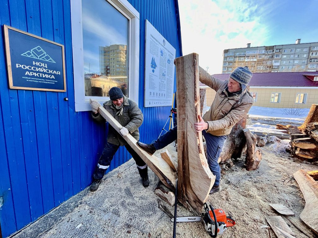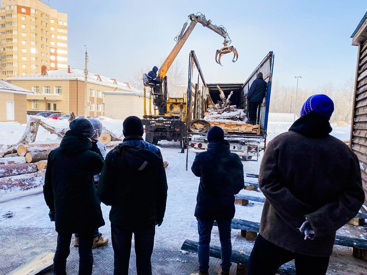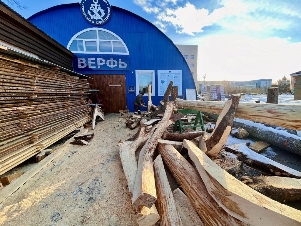 В марте на верфь привезли лес, заготовленный для морского карбаса осенью в Красноборском районе: кокоры для штевней, киля и шпангоутов, сосновые бревна и восьмиметровые доски с обзолом для обшивки лодки. Разгрузили материалы вместе со студентами САФУ.