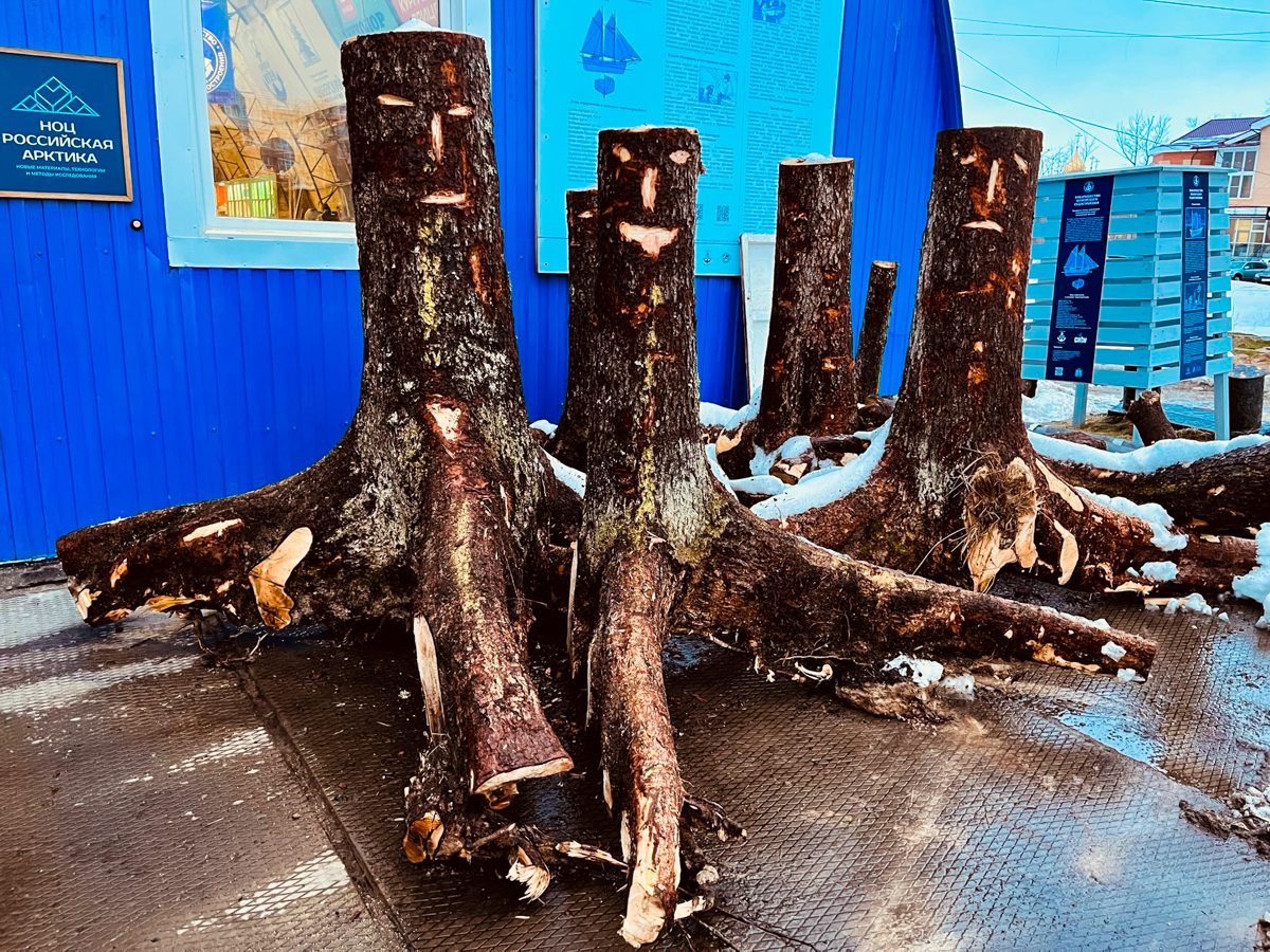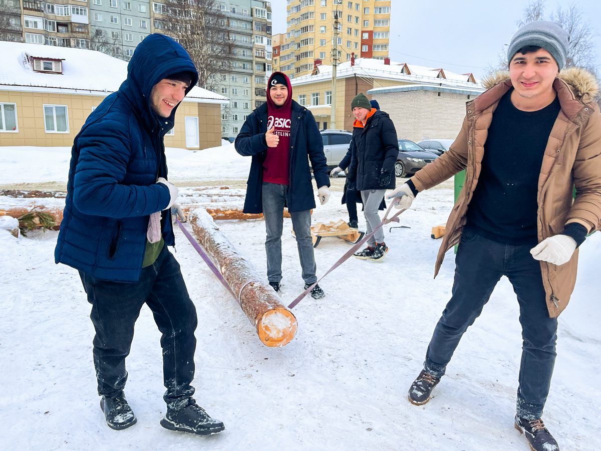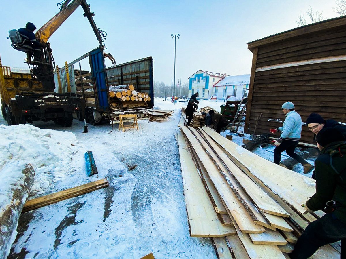 В марте на верфь привезли лес, заготовленный для морского карбаса осенью в Красноборском районе: кокоры для штевней, киля и шпангоутов, сосновые бревна и восьмиметровые доски с обзолом для обшивки лодки. Разгрузили материалы вместе со студентами САФУ.