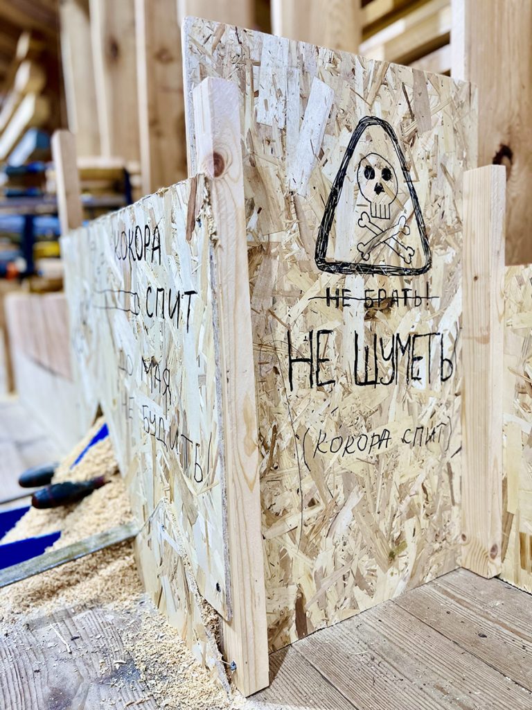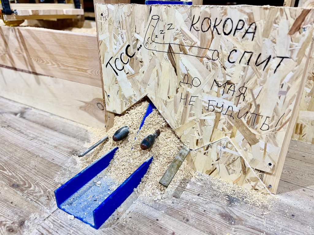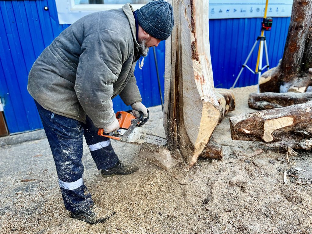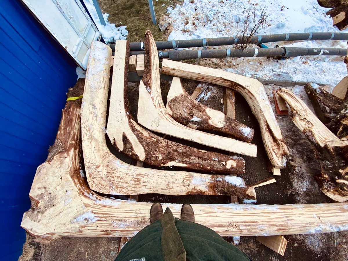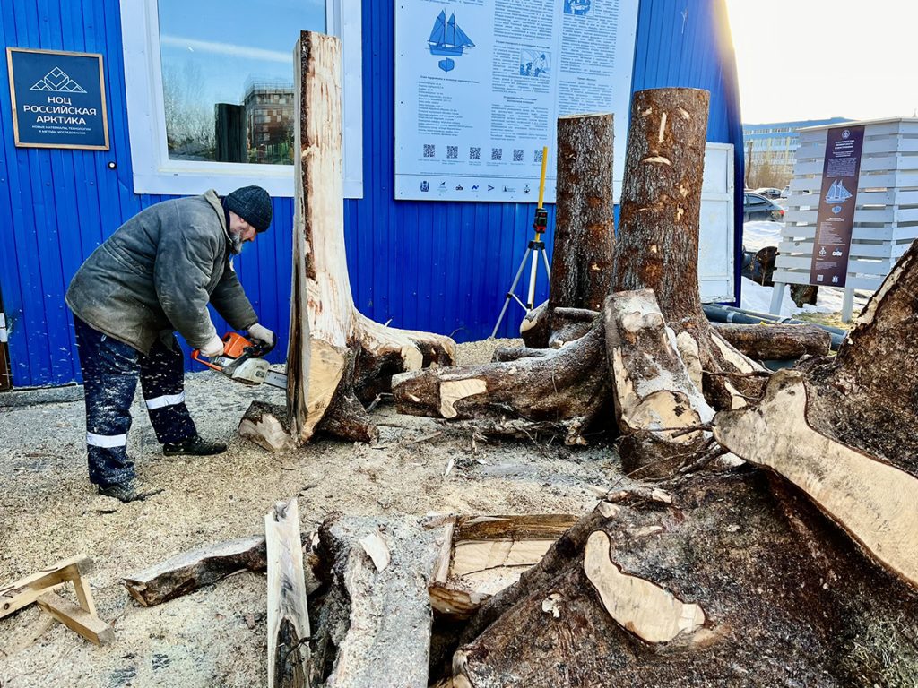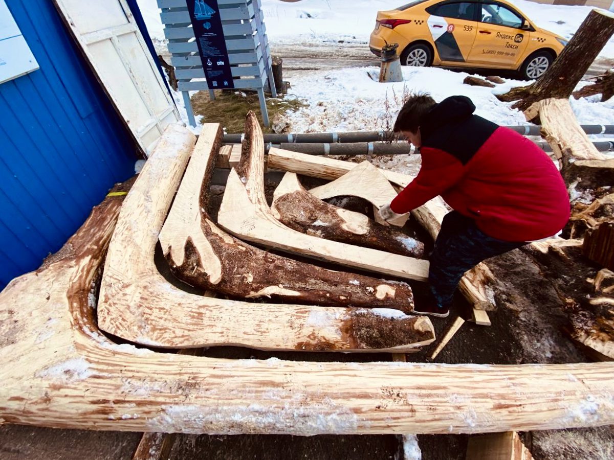 К концу марта столяр верфи Артем Бывальцев выпилил первый закоренок (деталь, которая станет ахтерштевнем морского карбаса), а затем и большую кокору, которая будет образовывать киль с форштевнем.