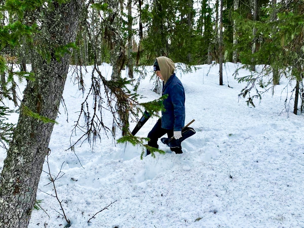 В высоких весенних сугробах команде удалось выбрать и спилить несколько елок, и комплект леса для большого морского карбаса был, наконец, полностью заготовлен.