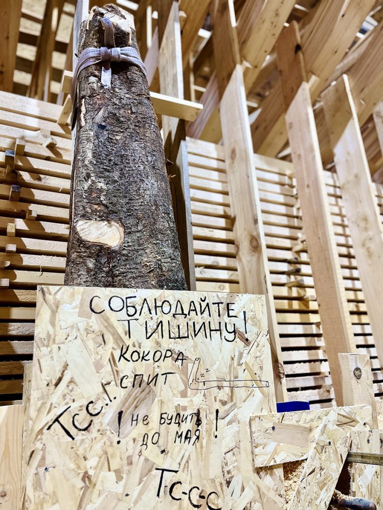 Заготовленную для форштевня с килем кокору уложили в опилочную «постель». Там она будет сушиться до конца мая.