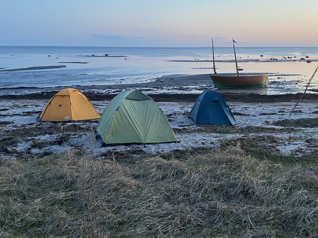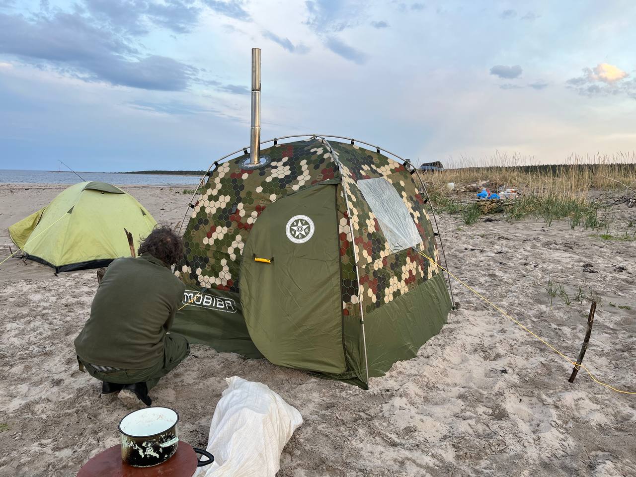1450, перекусили кулебяками с палтусом и выпили чая с сахаром. Тем временем прошли мыс Печак и вышли в салму. Ветерок слабый, встречный, студеный, но солнце шпарит как раскаленная сковородка. Под синим небом расстелили спальники и разбрелись по снам и легким дремам.