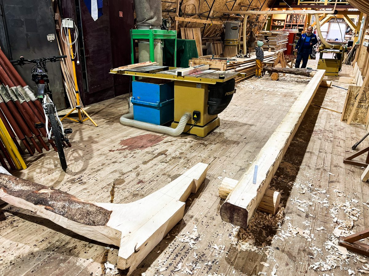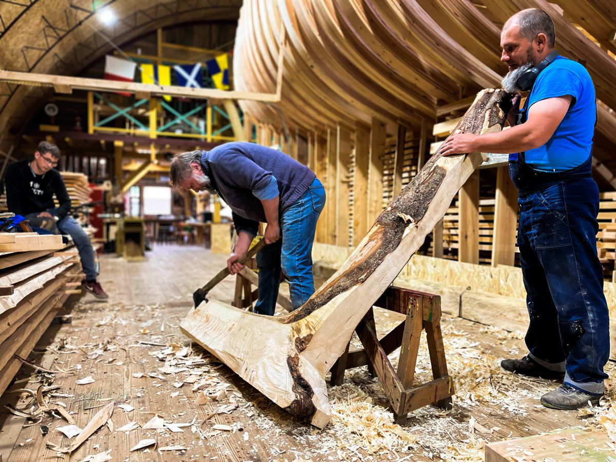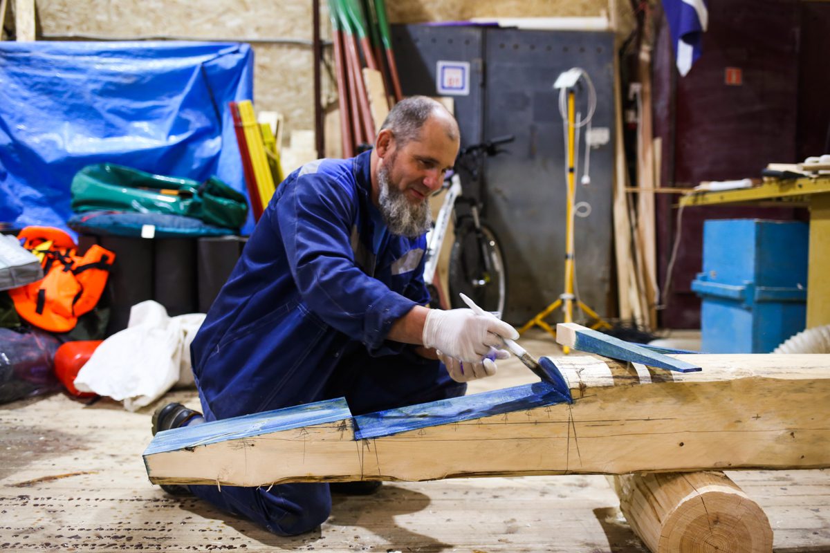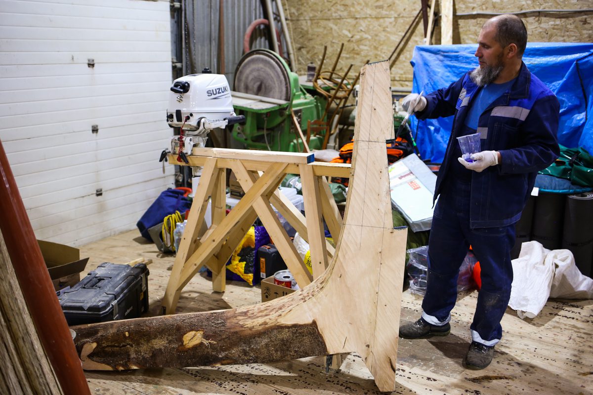 Работа с кокорой сложная – это потому, что мы взялись шить лодку по традиционной технологии и пользуемся ручным инструментом. Если подойти к нашим мастерам поближе, можно услышать, как Артем говорит: «Давай его фуганем, пока никто не смотрит». Саша так же тихо отвечает: «Дак все смотрят. Все смотрят».