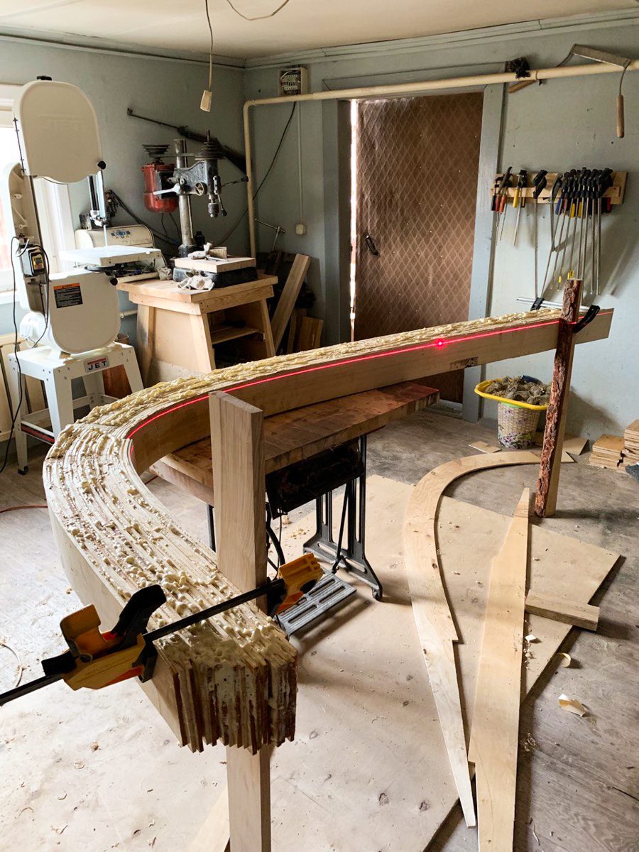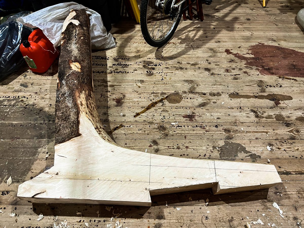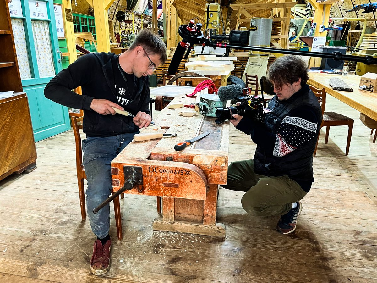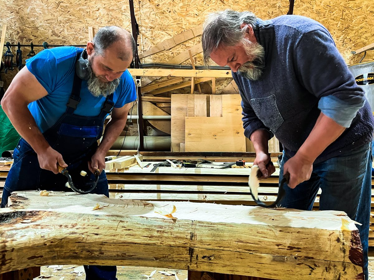 Работа с кокорой сложная – это потому, что мы взялись шить лодку по традиционной технологии и пользуемся ручным инструментом. Если подойти к нашим мастерам поближе, можно услышать, как Артем говорит: «Давай его фуганем, пока никто не смотрит». Саша так же тихо отвечает: «Дак все смотрят. Все смотрят».