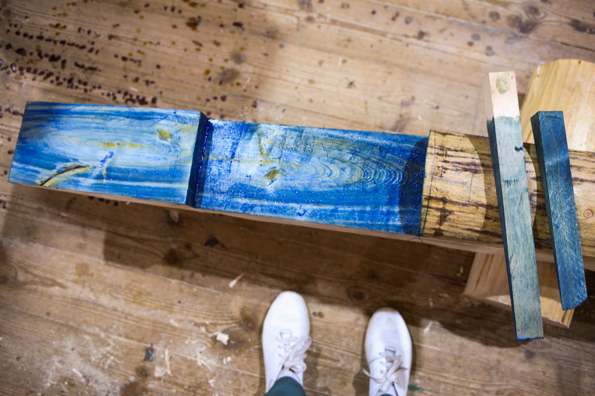 Артем выстрагивает добор форштевня шхуны и пропитывает его, как он говорит, синей гадостью.