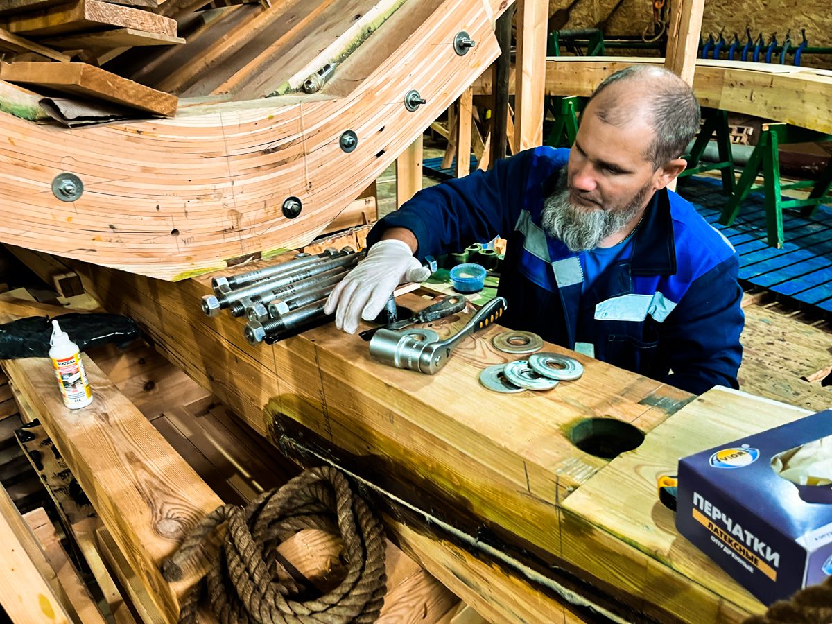 Артем закончил ставить шпильки эпического форштевня «Поморской шхуны».