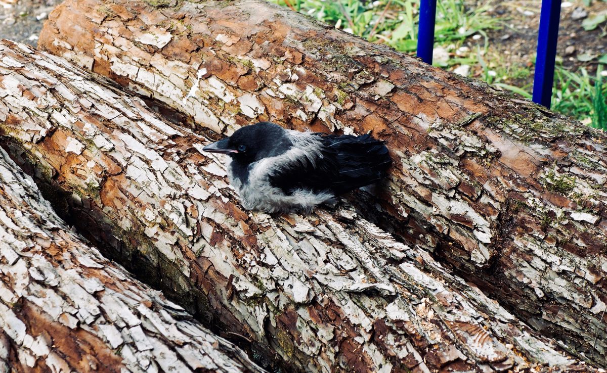 Если вы увидели симпатичного голубоглазого воронёнка, то это птенец-слёток, который, как ему и положено, выпал из гнезда и теперь некоторое время будет тусоваться в траве – пока не придёт в разум. Скорее всего, у него всё в полном порядке и помощь ему не требуется – к нему периодически прилетают родители, которые ищут еду где-то неподалёку.
