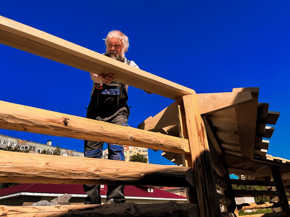 Студенты Даня и Миша пилят доски на кровлю экспозиционной галереи, Ваня приколачивает их гвоздями к небесам под руководством Саши Антонова.