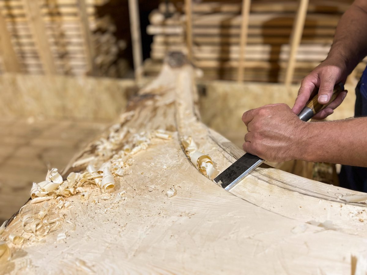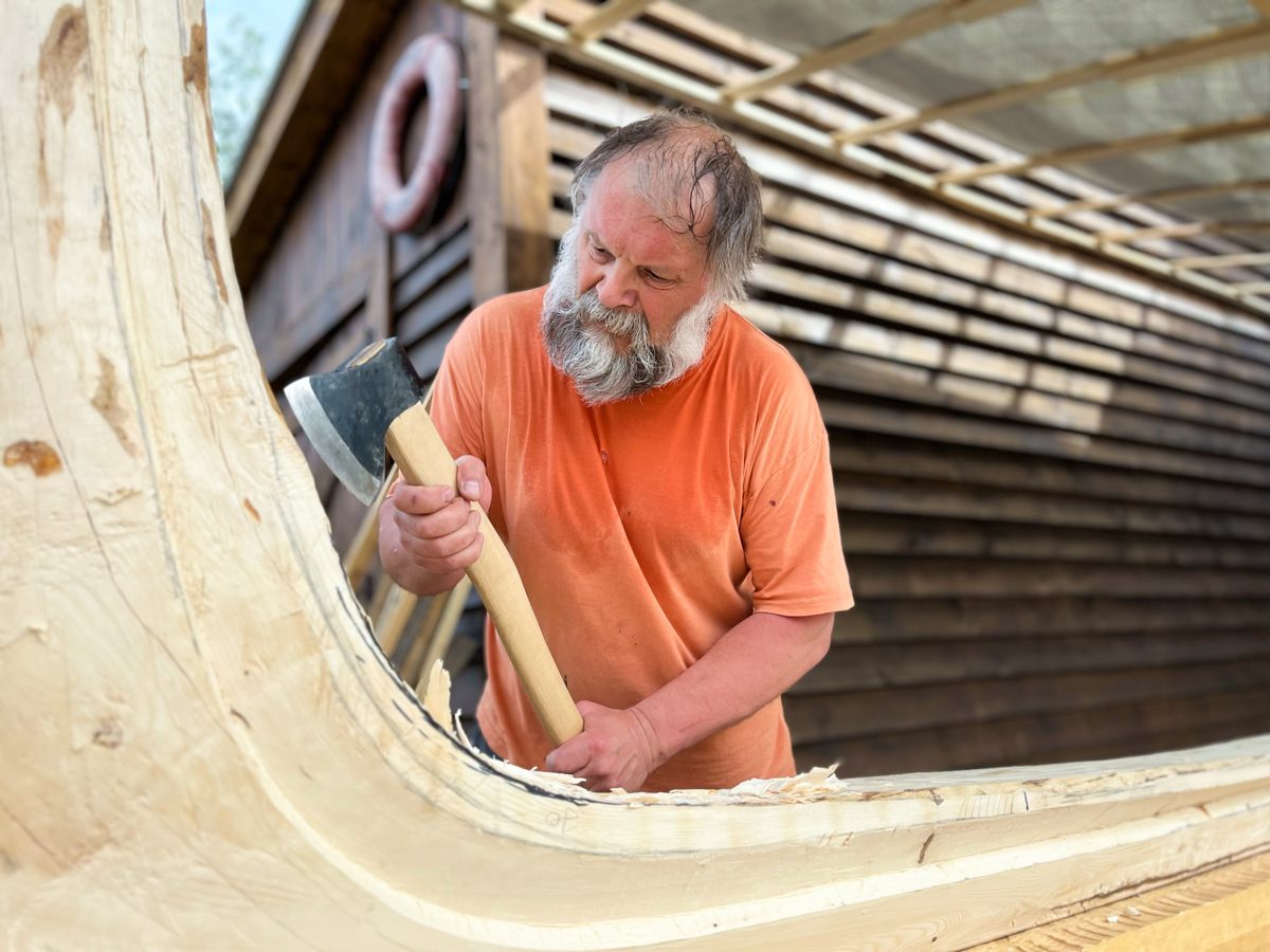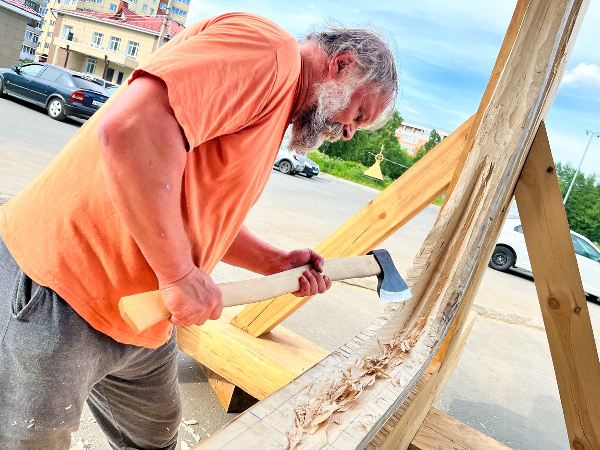Продолжаем штатно возиться с закладкой большого морского карбаса. Артём с Сашей вырезают и вырубают шпунт: топорами, стамесками и скобелями.