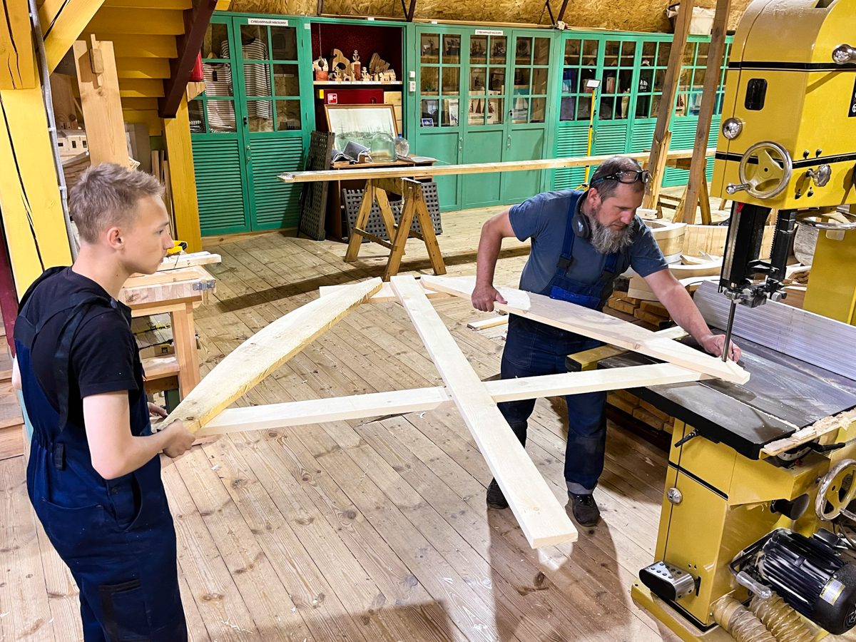 Александр руководит практикантами Даней, Мишей и Никитой, которые пилят доски на обшивку карбаса.