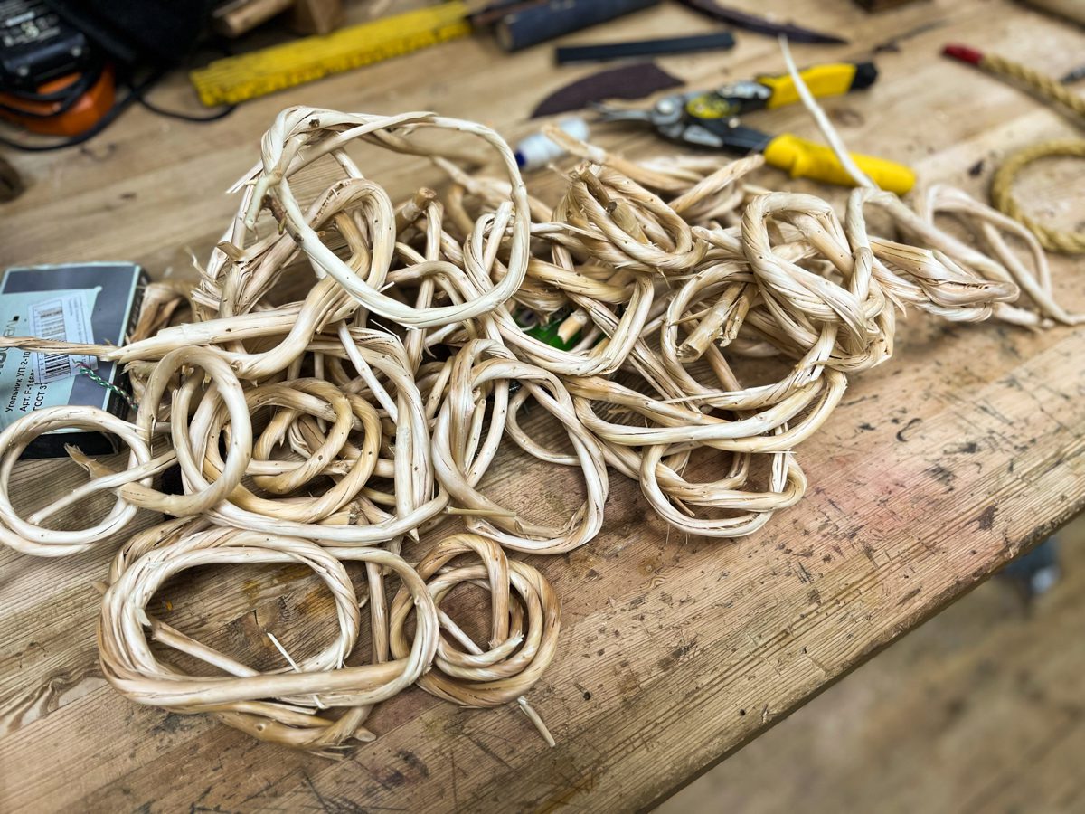 Ветки мы чистим от коры, гнем и замачиваем, вот так: