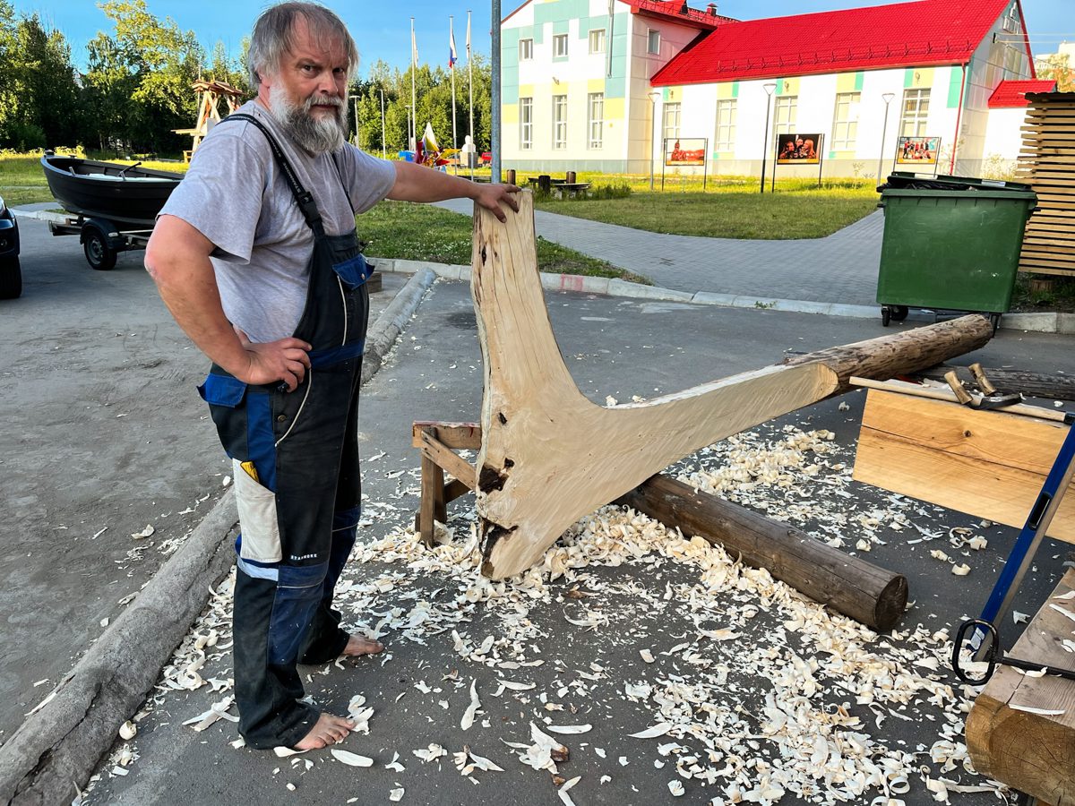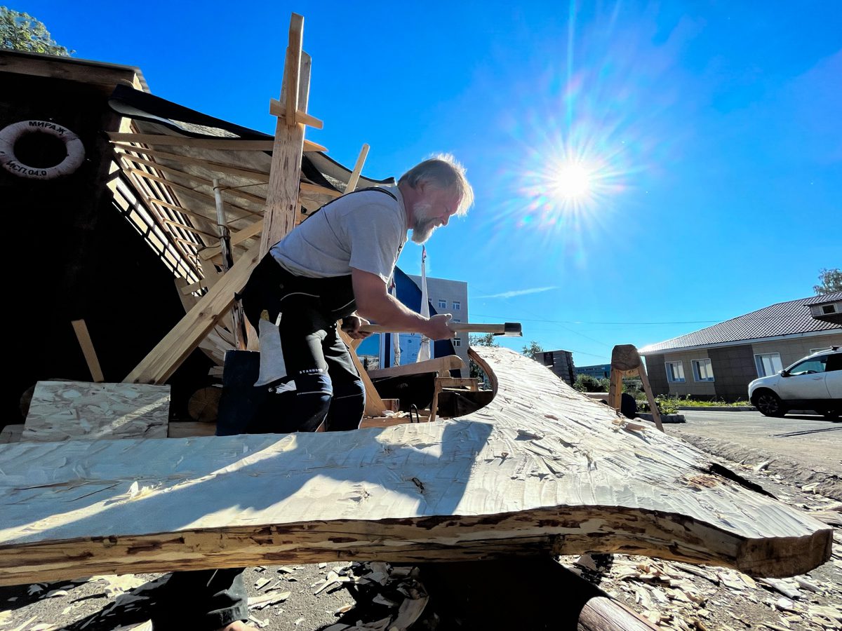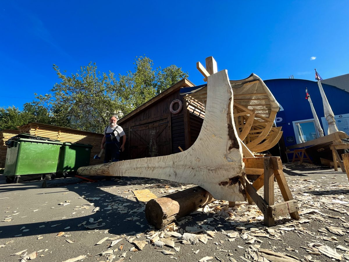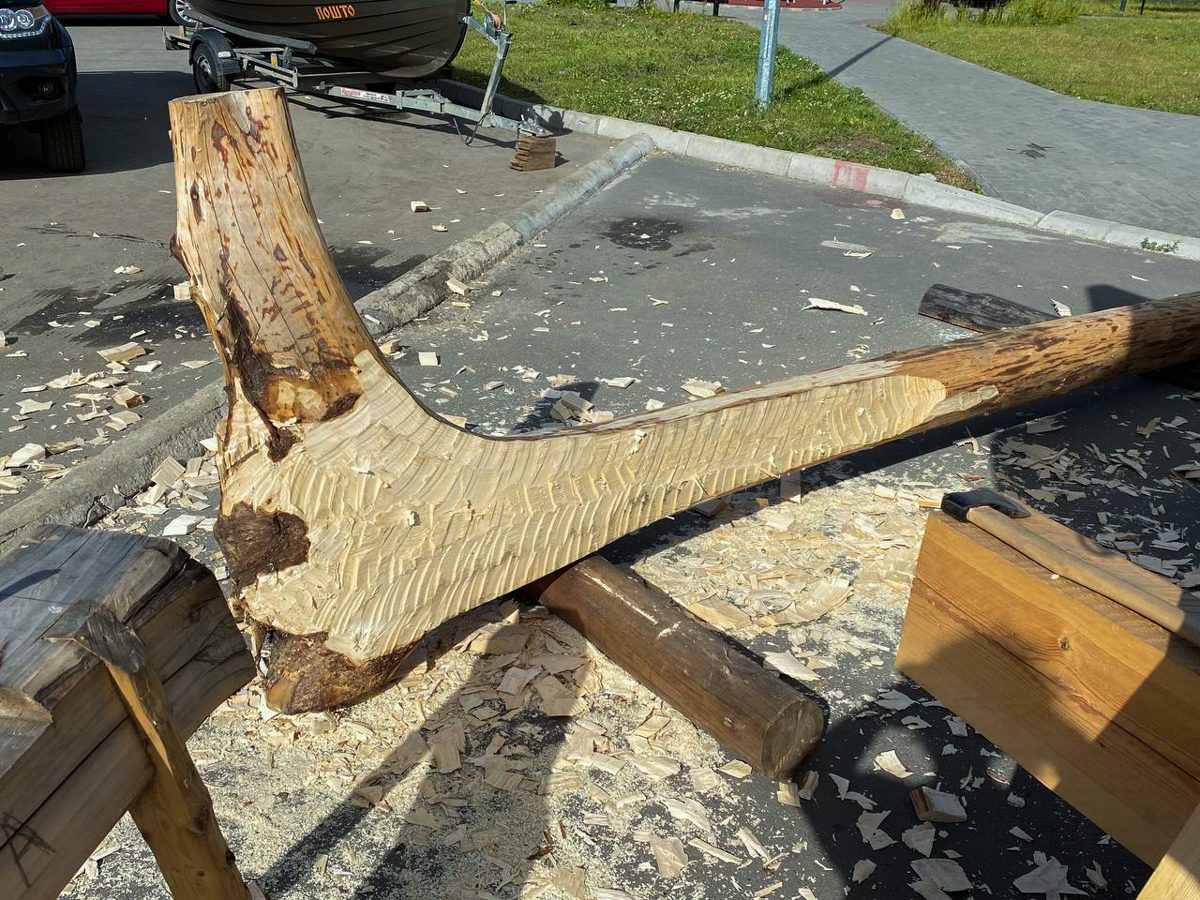 Саша Антонов продолжает скульптурные работы с пером руля: выводит его профиль, вытесывает лишнее топором, убирает мясо. Вся работа делается по волокнам, чтобы в будущем перо не увело, не закривило и не загнуло. Деталь выполняется по форме корня из цельного комля с кокорой.  Окончательный размер пера будет определен при установке на карбас, а пока что всё делается с запасом.