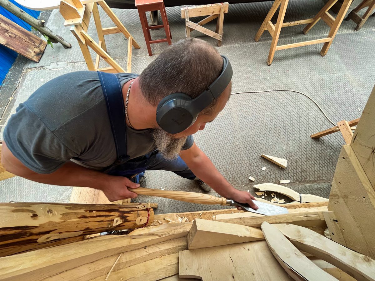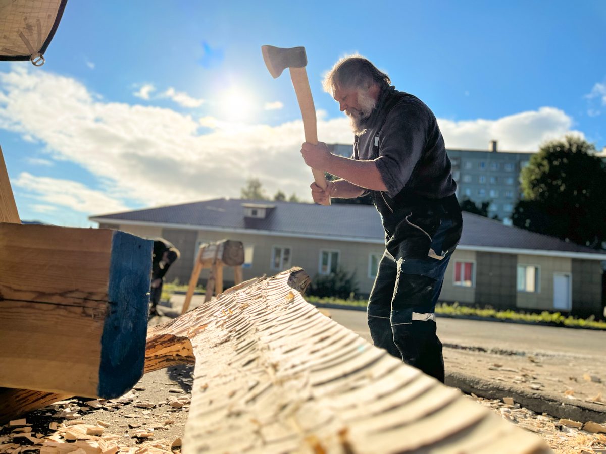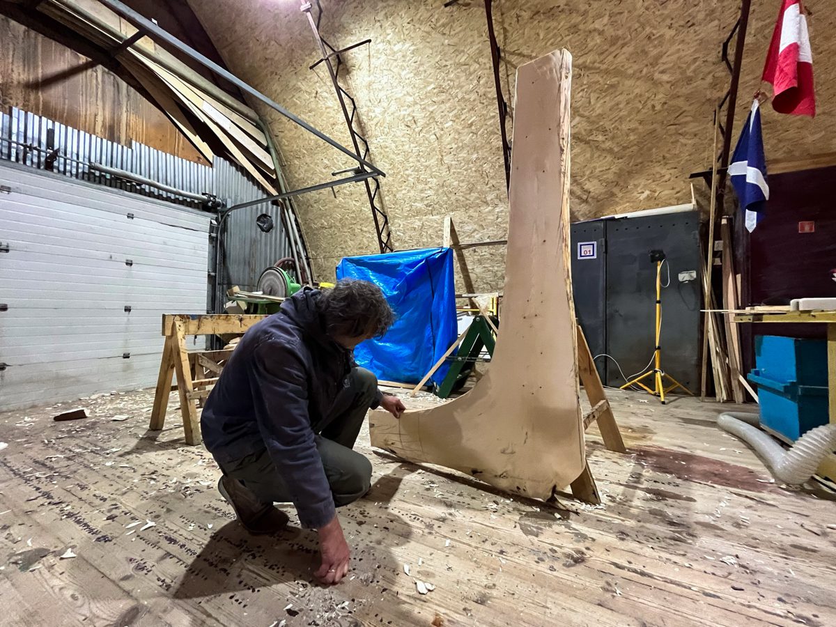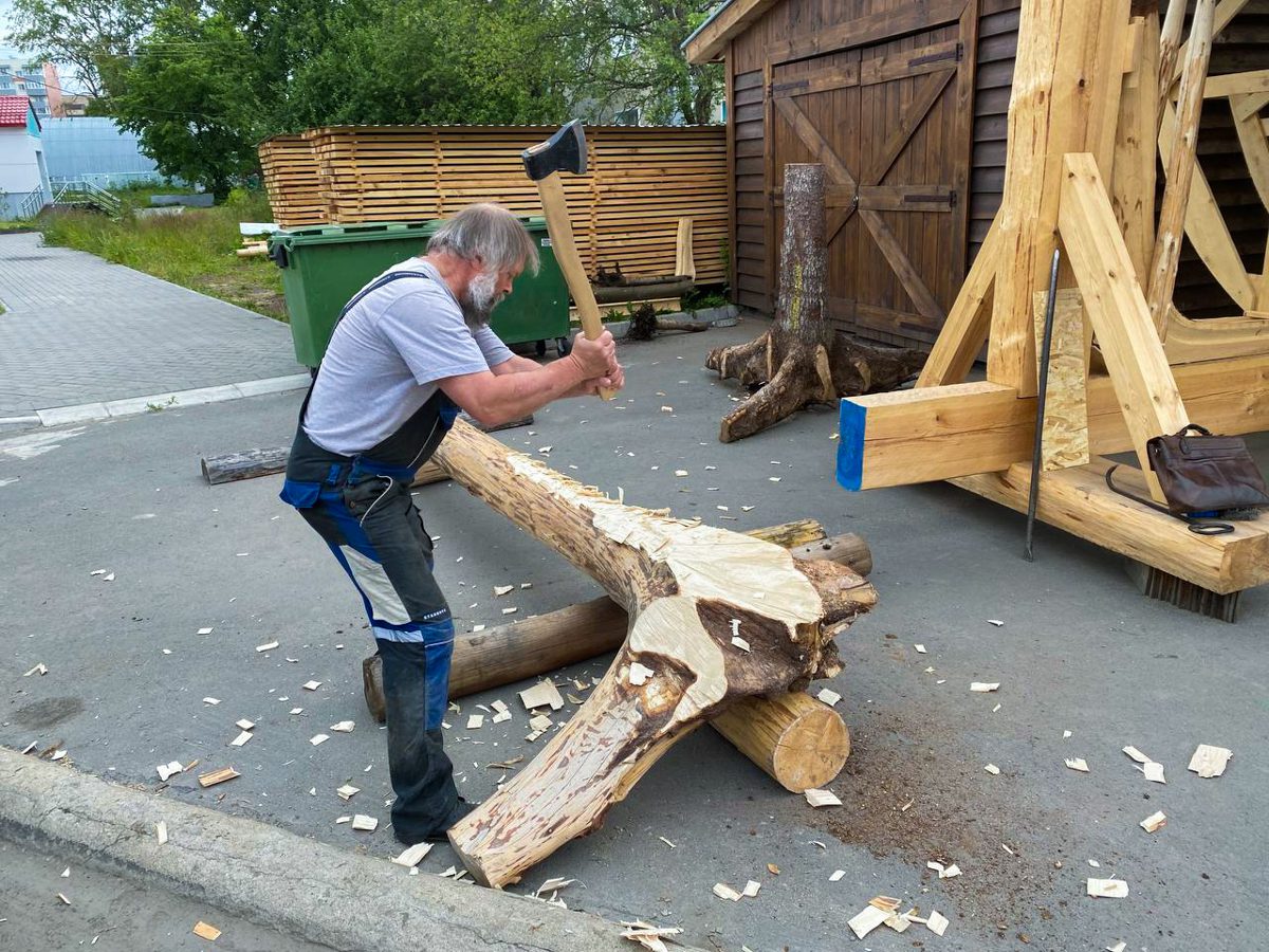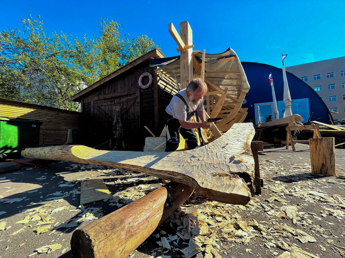 Саша Антонов продолжает скульптурные работы с пером руля: выводит его профиль, вытесывает лишнее топором, убирает мясо. Вся работа делается по волокнам, чтобы в будущем перо не увело, не закривило и не загнуло. Деталь выполняется по форме корня из цельного комля с кокорой.  Окончательный размер пера будет определен при установке на карбас, а пока что всё делается с запасом.