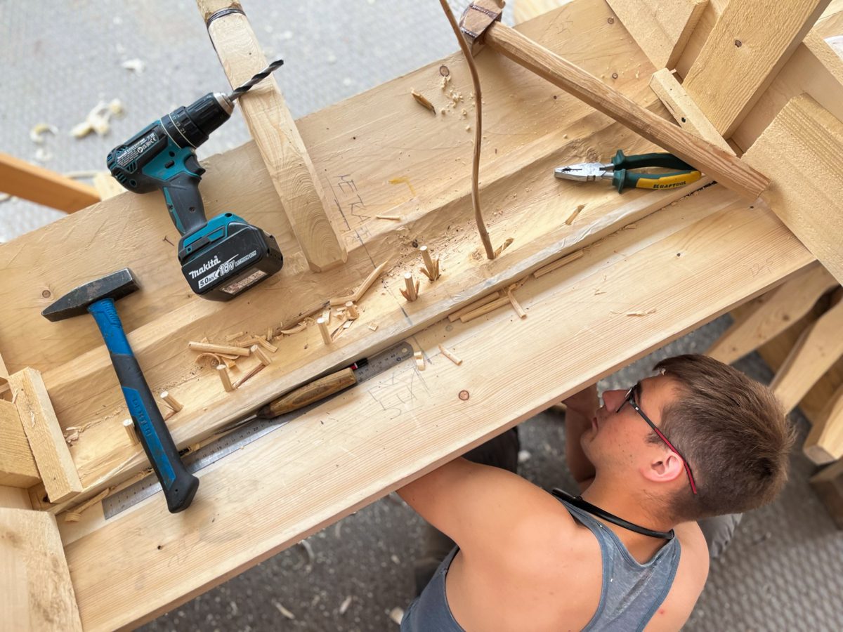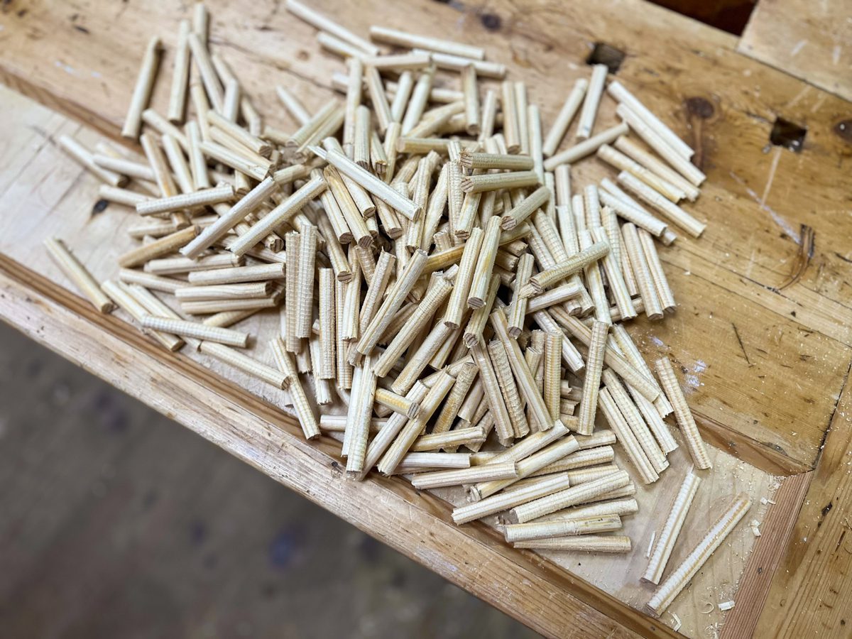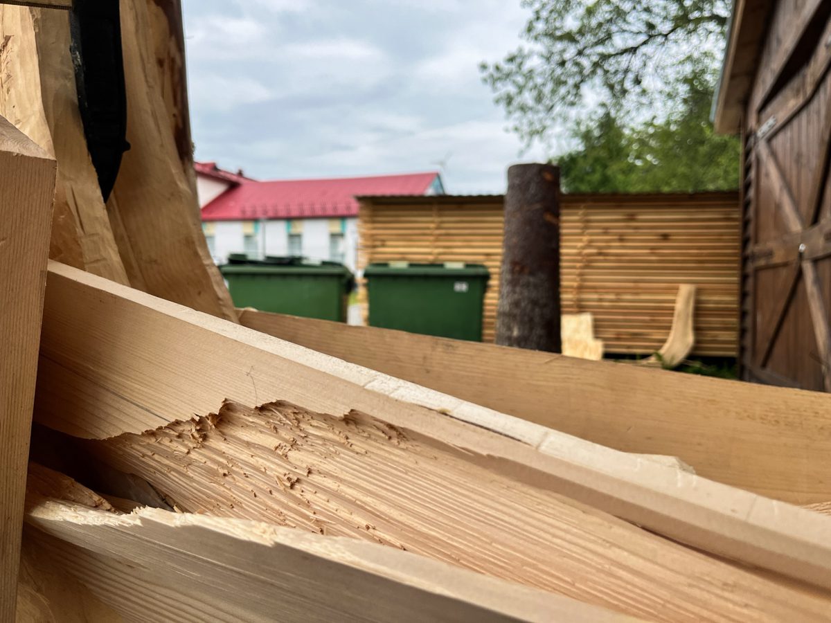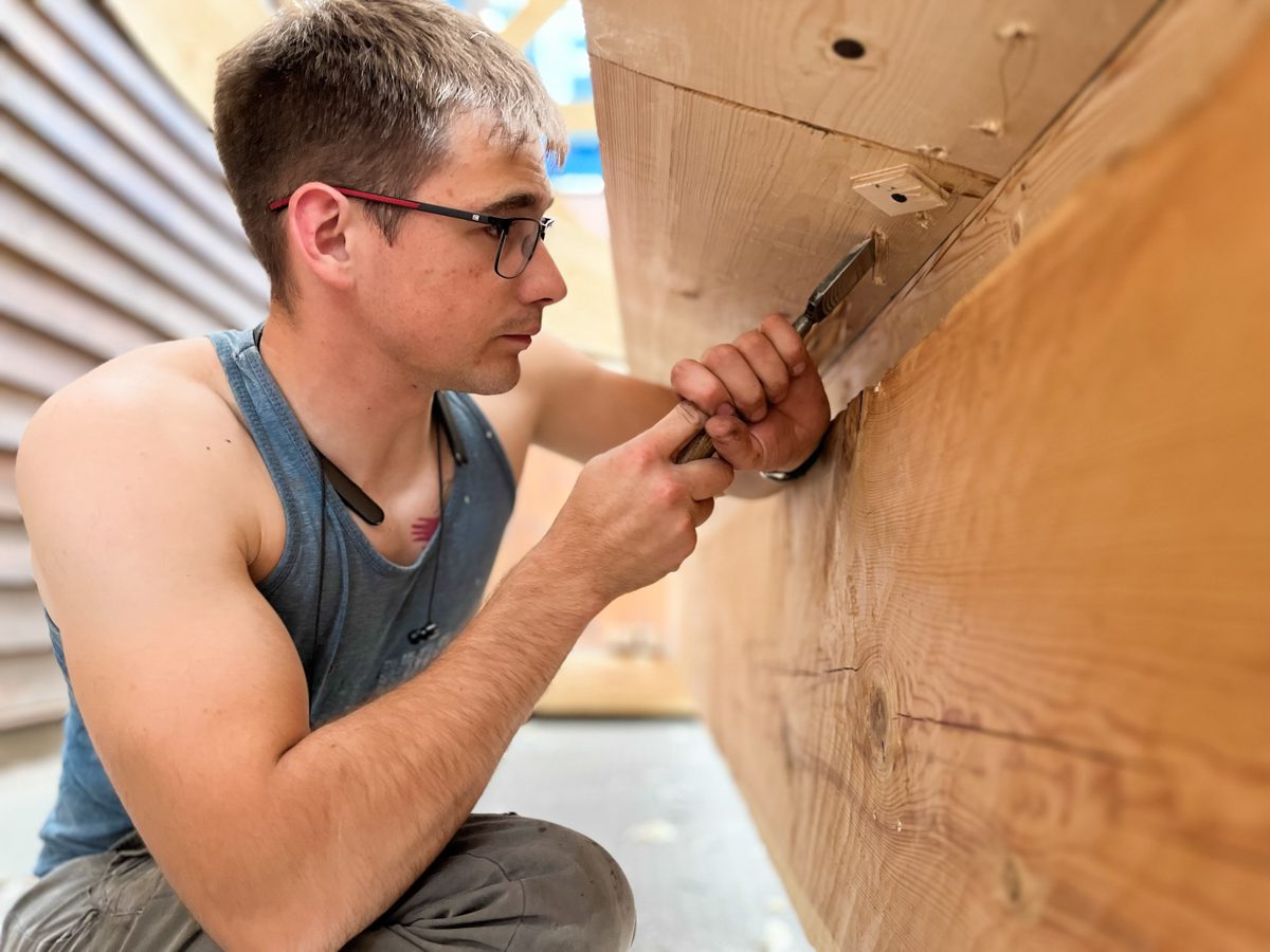 Саша Антонов продолжает скульптурные работы с пером руля: выводит его профиль, вытесывает лишнее топором, убирает мясо. Вся работа делается по волокнам, чтобы в будущем перо не увело, не закривило и не загнуло. Деталь выполняется по форме корня из цельного комля с кокорой.  Окончательный размер пера будет определен при установке на карбас, а пока что всё делается с запасом.