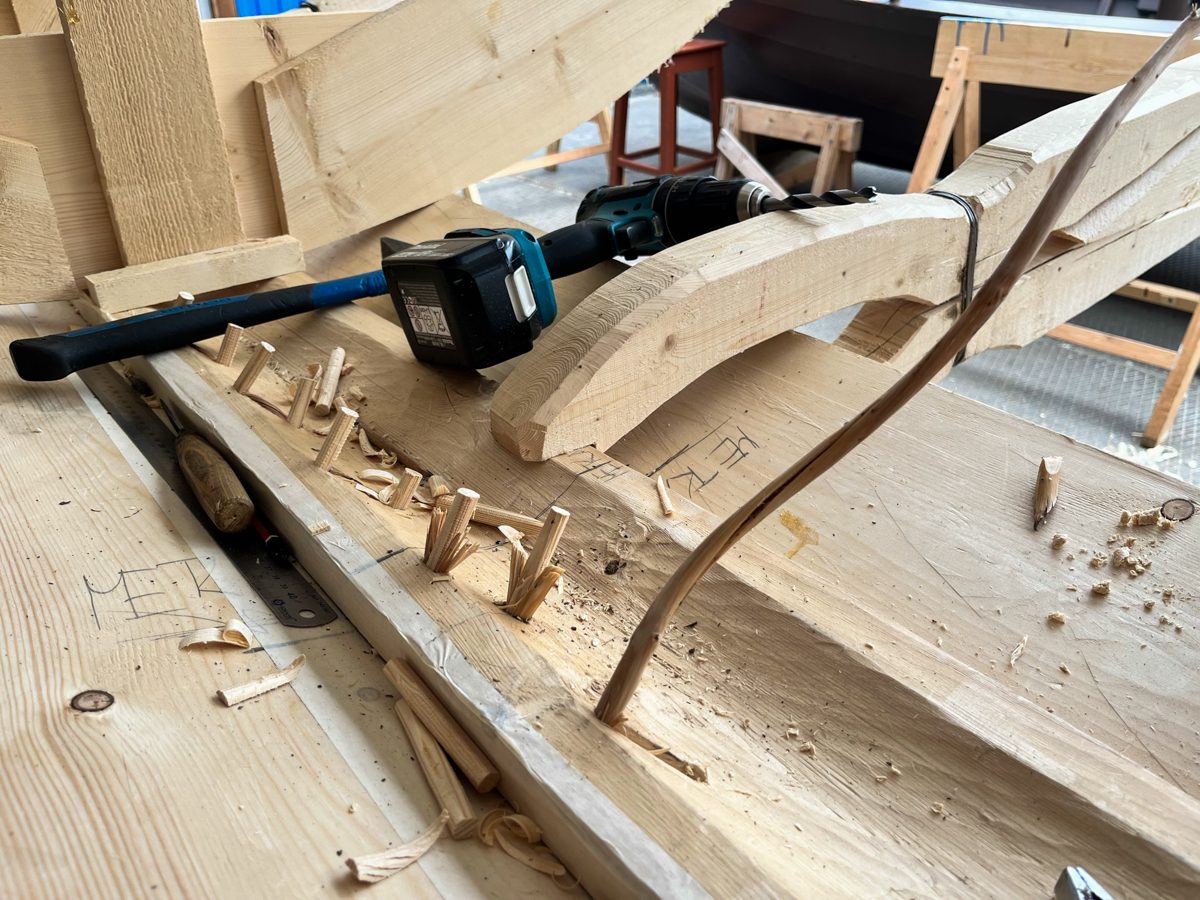 По ходу работы ведутся споры о конструкции румпеля. Мы хотим румпель с узорами, но стандартное решение конструкции не позволяет развернуться в художественном плане. Придётся искать золотую середину между судостроительными стандартами и стремлением к красоте.