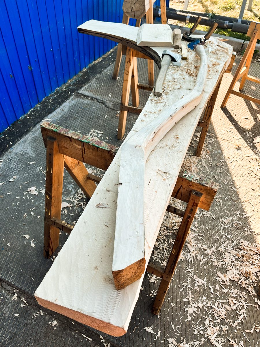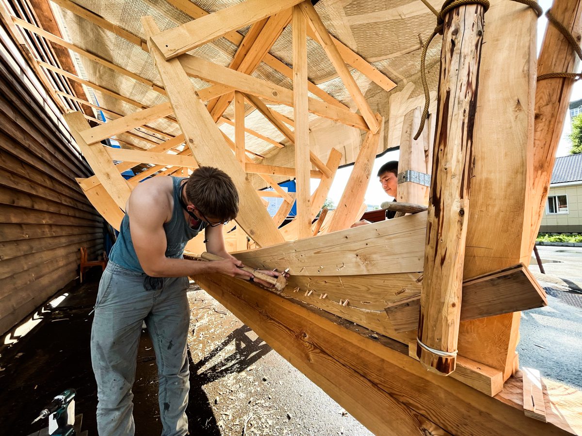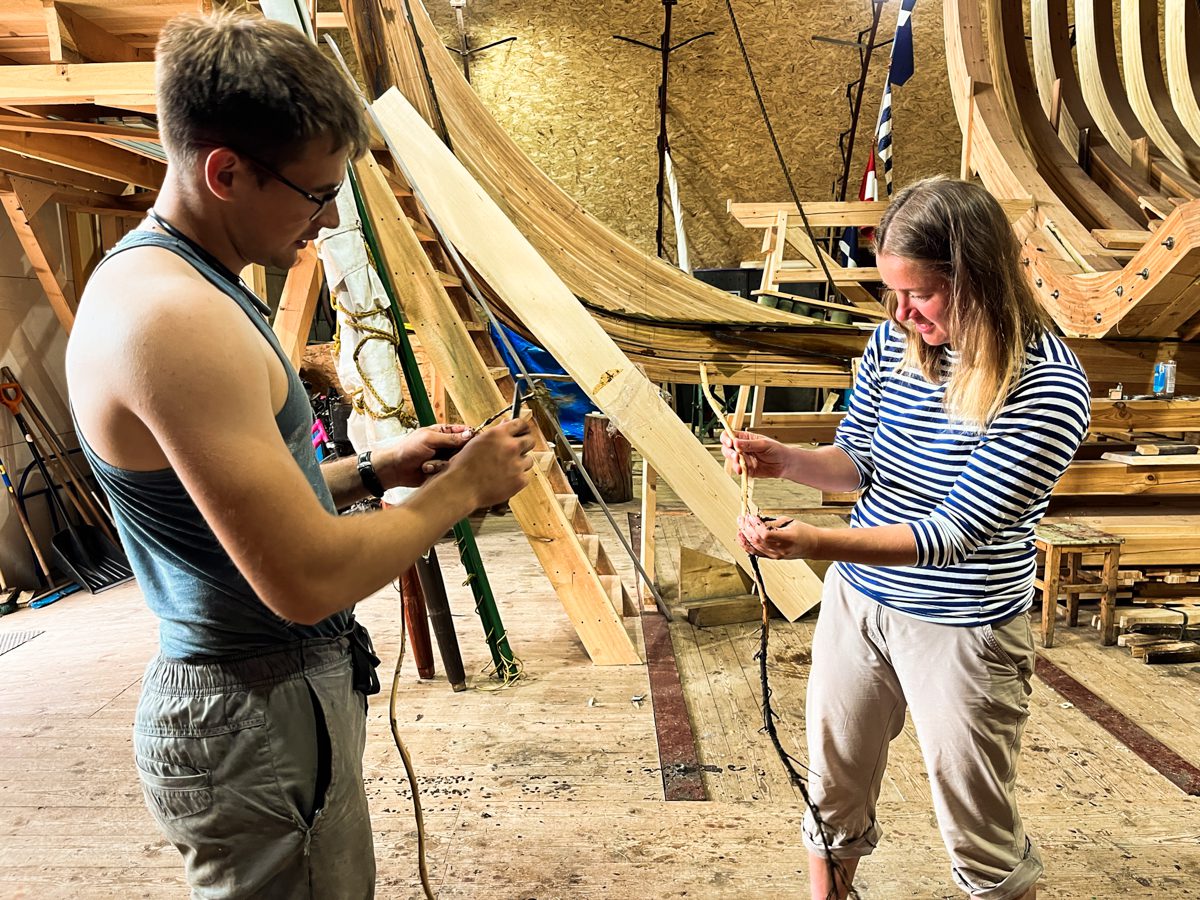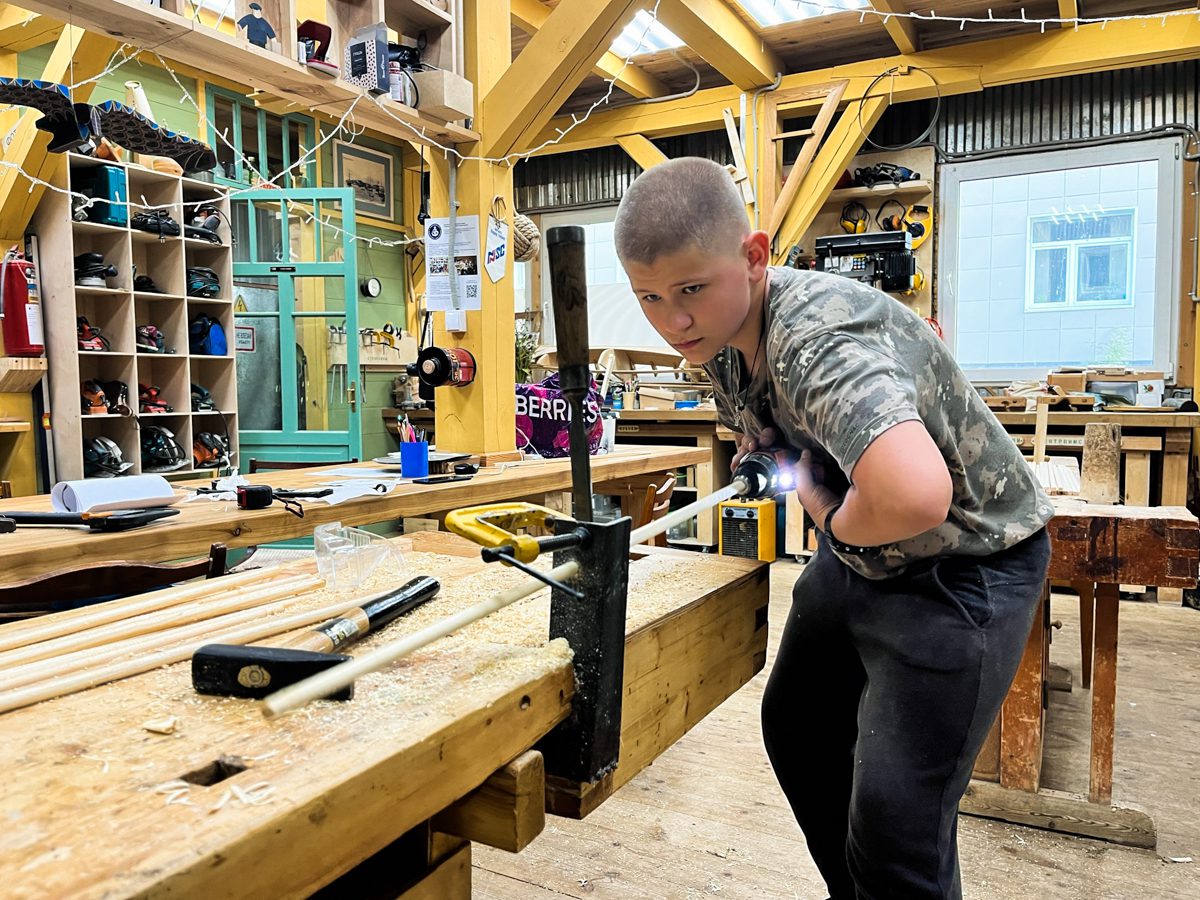 Матвей из Школы поморского судостроения строгает нагеля для шитья карбаса. Ваня сделал ему кондуктор, и дело пошло веселее.