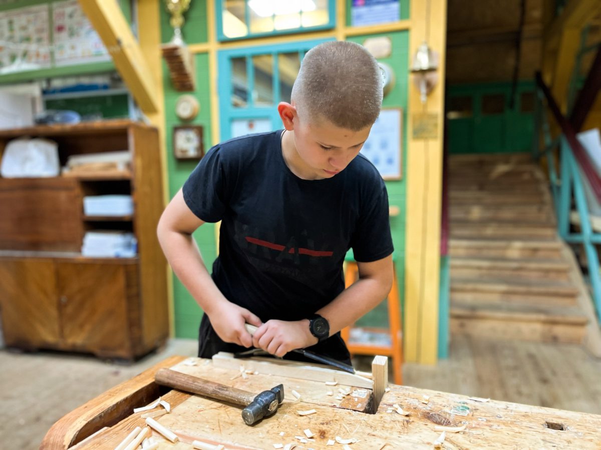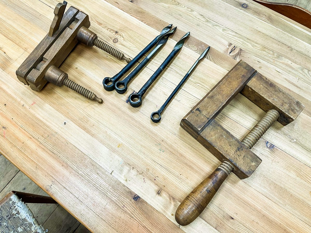 Раздобыли в свою коллекцию наборчик буров, деревянную струбцинку и приспособление, название которого Женя и Артём сказать не смогли, а Катя сказала, что это шпунтубель, и засияла в своём терминологическом столярном блеске.