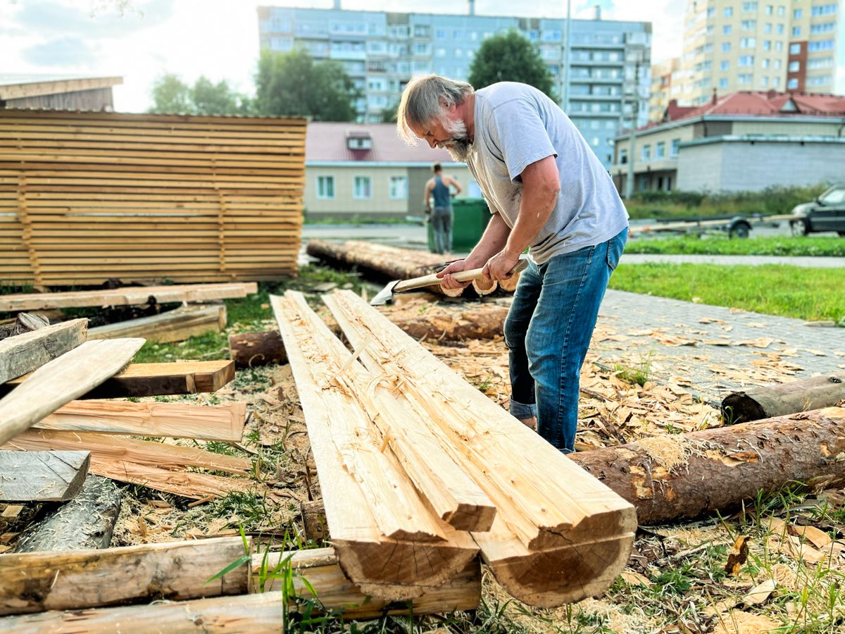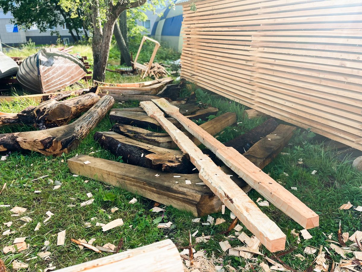 Распилили и окорили карагач для различных нужд. Катя говорит, что её тоже нужен карагач, а Тёма ответчает: «Так возьми, конечно, но как? Он весит, как две ты».