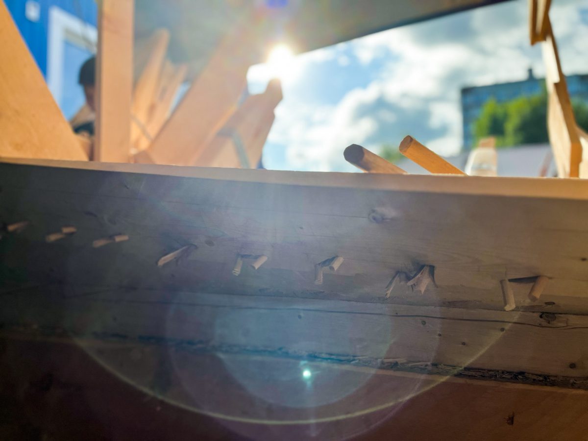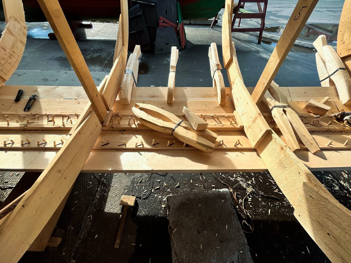 Начали шить второй набой мангазейского карбаса. Ёлка капризная, набои не слушаются, пробуем и силой, и уговорами. Один только пояс повел себя достойно – правый шпунтовый.